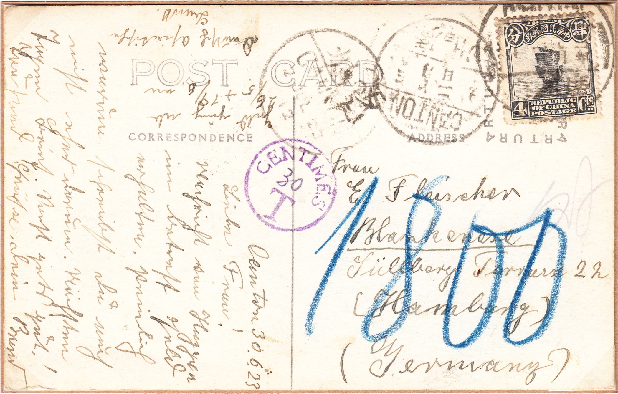 Bei dieser "Pfingsten 1923" (Pfingsten 1923 war am 20./21.05.) geschriebenen und in CANTON in China aufgegebenen Ansichtskarte wurde ein entsprechender Einkreisstempel in Violett "CENTIMES T" abgeschlagen, der handschriftlich um eine "30" ergänzt wurde: