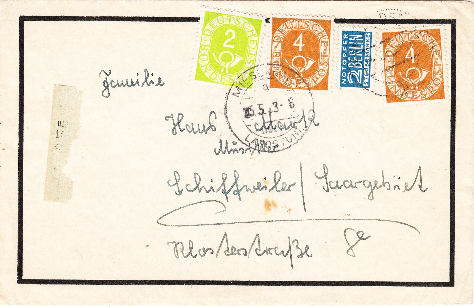 Die Post entfernte den Klebezettel bis auf ein kleines, erhalten gebliebenes Fragment, und stempelte die ergänzte Frankatur am 25.05.1953 in MIESENBACH über LANDSTUHL.