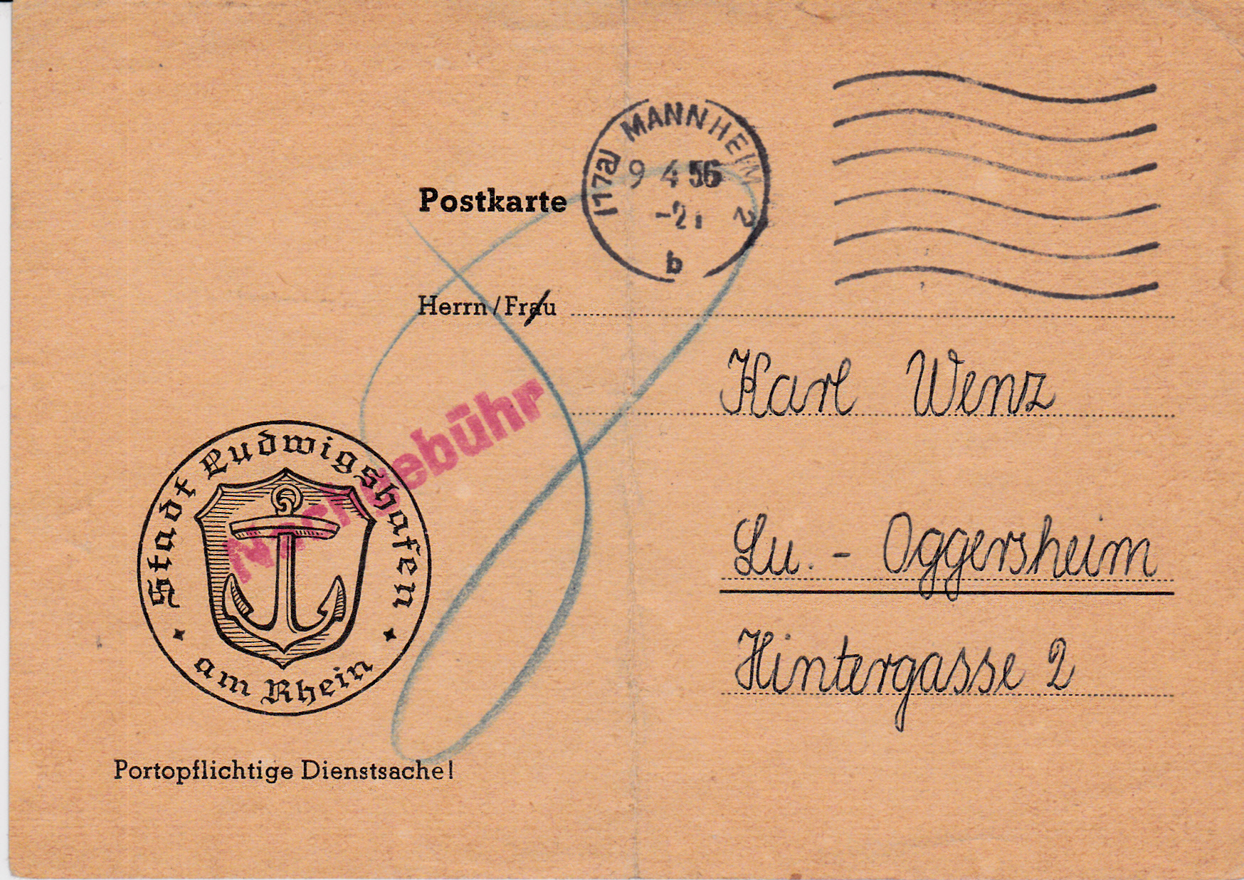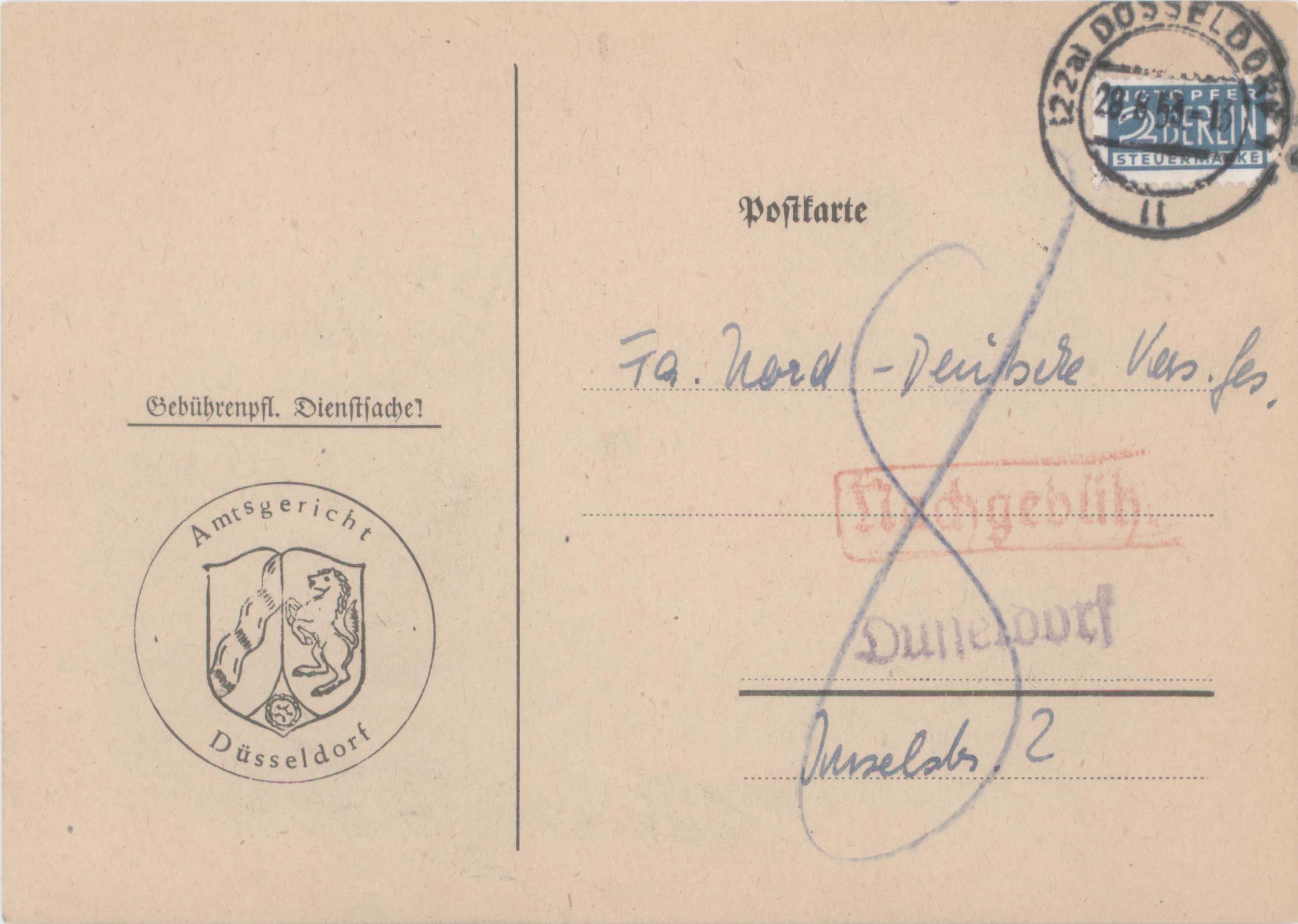 Hier ein Postkartenvordruck, bei dem der notwendige Text "Portopflichtige Dienstsache" und das Siegel bereits aufgedruckt war. Es wurde das normale Postkartenporto für eine Ortspostkarte, das waren im April 1956 8Pf, vom Empfänger kassiert. Dies ist durch die Zahl 8 und den roten Nachgebühr-Stempel auf der Karte dokumentiert.