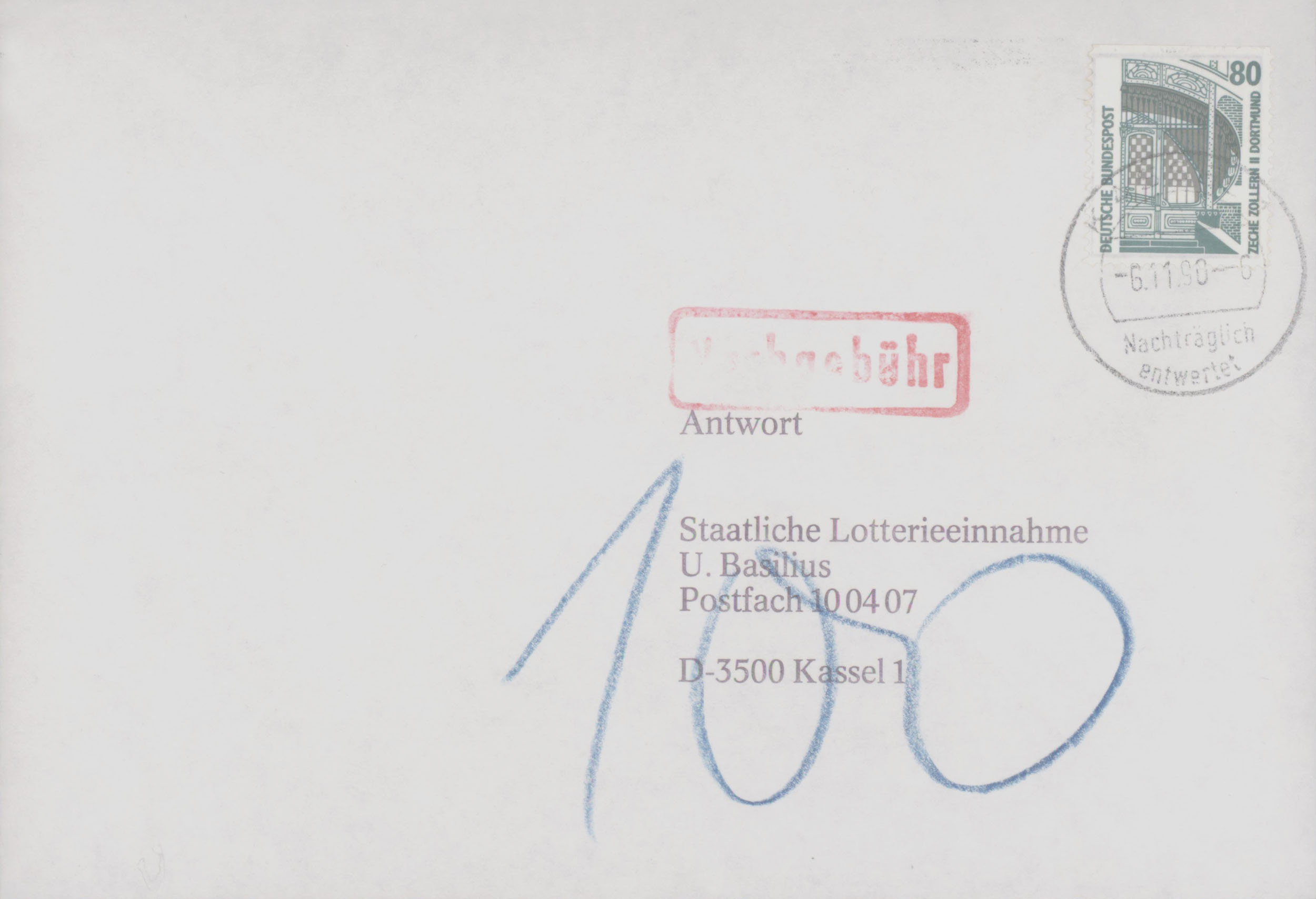 Anbei eine Postkarte, die mit 130 Pf frankiert und am 11.09.1991 in 6242 Kronberg im Taunus gestempelt wurde. Aufgrund der Nichteinhaltung der Standardmaße wurde diese Sendung als Brief der zweiten Gewichtsstufe bis 50g (170 Pf) eingestuft. Die 120 Pf Nachgebühr setzen sich aus dem Fehlbetrag von 40 Pf und der Einziehungsgebühr in Höhe von 80 Pf zusammen.