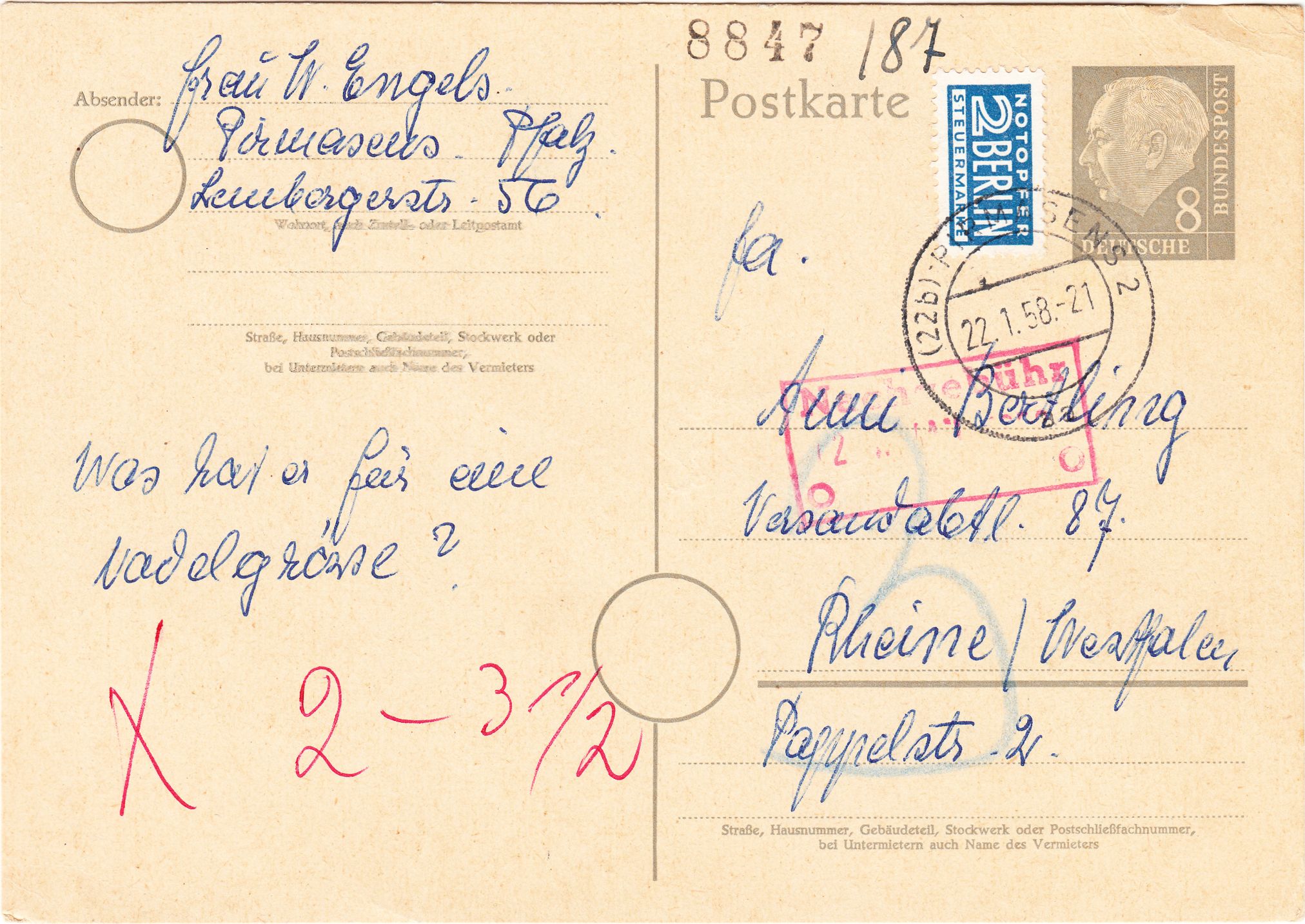 Die Sendungsart "Drucksache" wurde nicht anerkannt und daher durchgestrichen. Somit war aus der Portostufe zu 7 Pfennig für eine Drucksache die Portostufe 20 Pfennig für einen Brief im Fernverkehr geworden.
