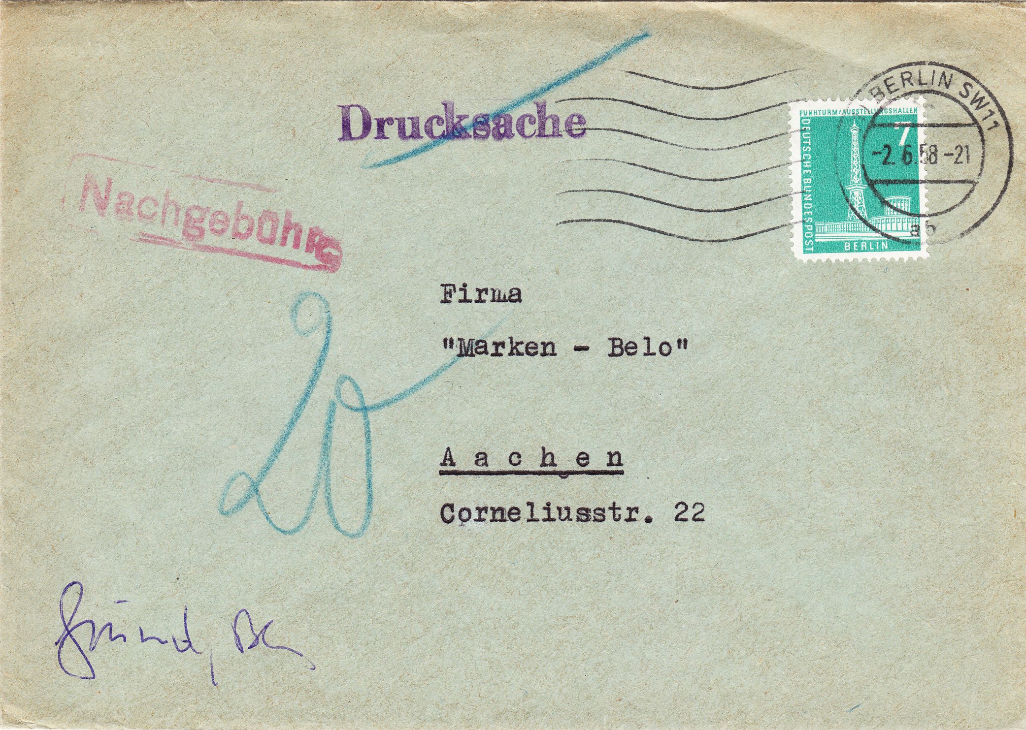 Dieser nach Aachen adressierte Beleg wurde als "Drucksache" am 02.06.1958 in Berlin aufgegeben: