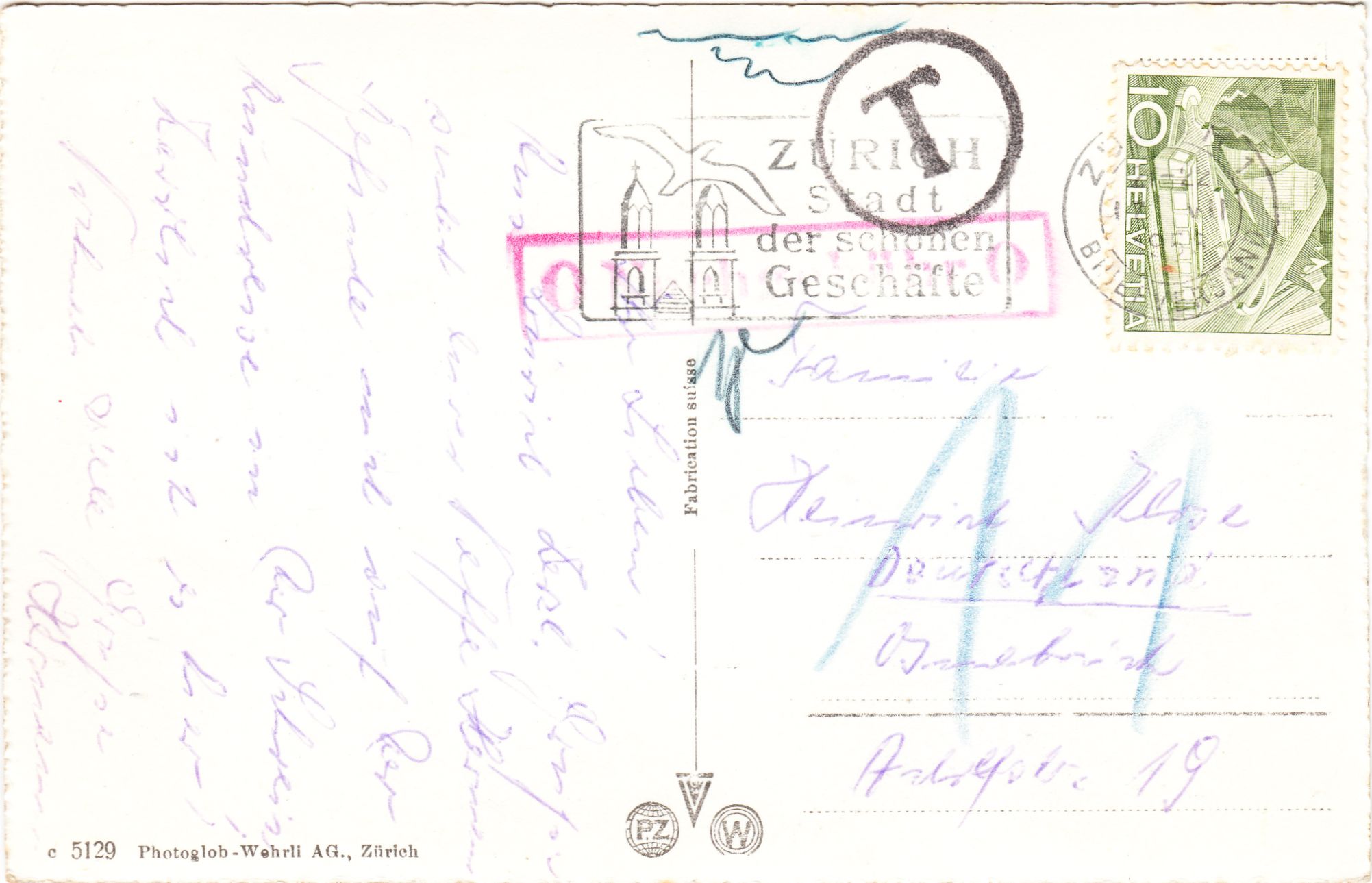 Diese Postkarte aus der Schweiz, die dort einen Taxstempel als Einkreisstempel "T" mit dem handschriftlichen Vermerk "18" erhielt wurde in Osnabrück mit "11" Pfennnig Nachgebühr belegt, worauf ein Nachgebührstempel "O Nachgebühr O" hinweist:
