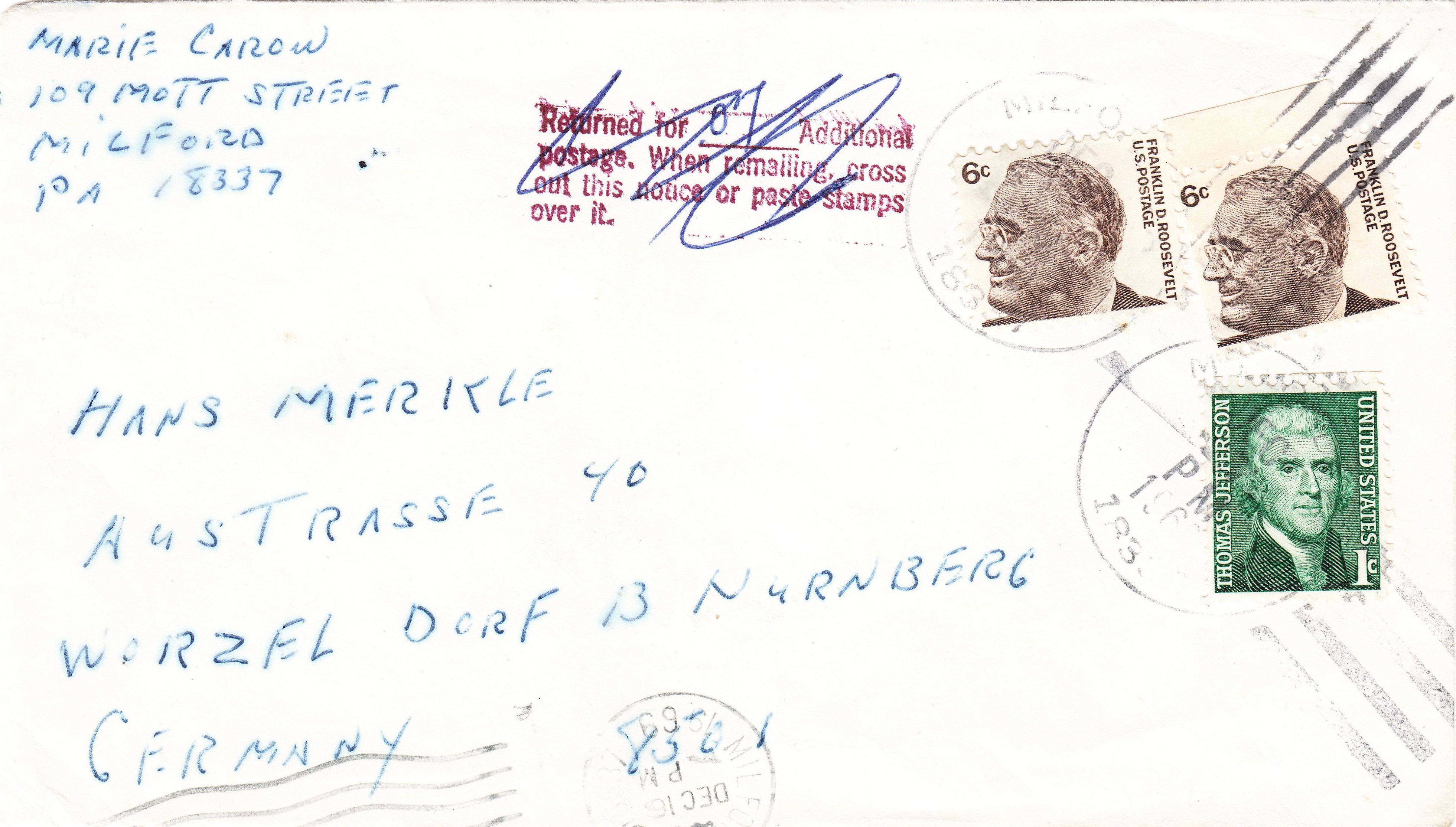 Hier ein solcher Brief aus dem Jahre 1969, adressiert nach Nürnberg, aufgegeben mit einer Freimachung von nur 6 Cents statt erforderlicher 13 Cents: