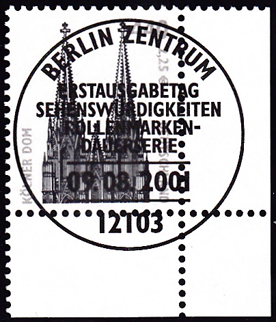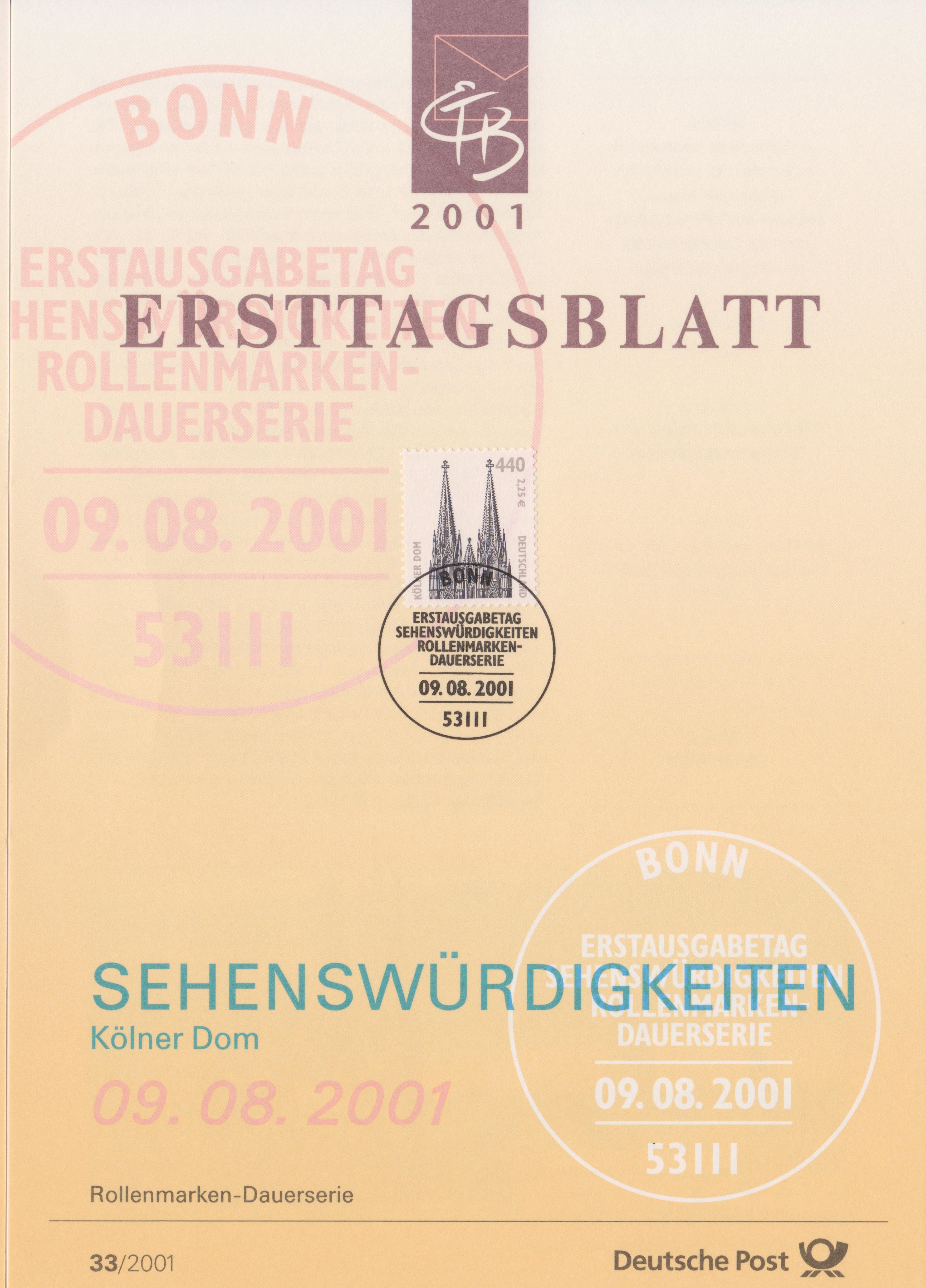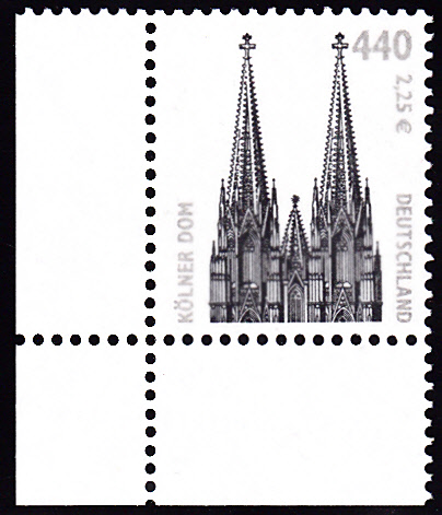 Am 9.8.2001 wurde die Marke zu 440Pf/02,25 € verausgabt, sie zeigt als Motiv den Kölner Dom. Hier eine Marke vom linken unteren Bogenrand: