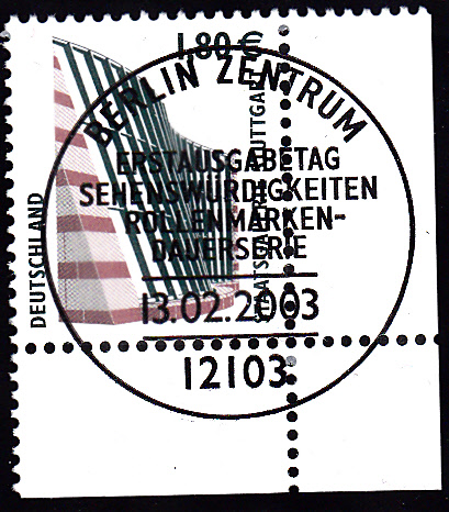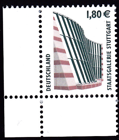 am 13.2.2003 wurde die Marke zu 1,80 € verausgabt, sie zeigt als Motiv die Staatsgalerie Stuttgart. Hier einmal als waagerechtes Paar mit Versandstellenstempel: