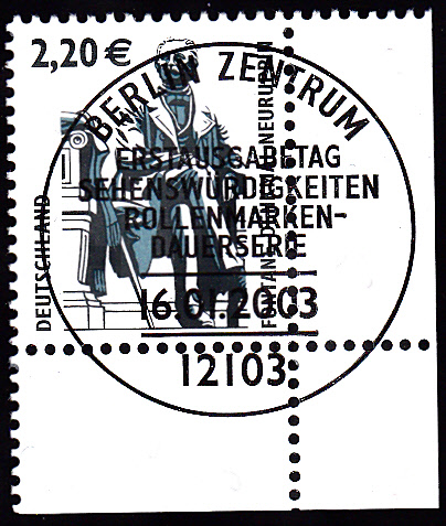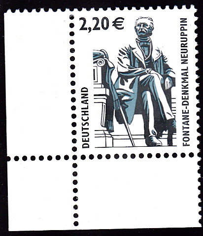 am 16.1.2003 wurde die Marke zu 2,20 € verausgabt, sie zeigt als Motiv das Fontane-Denkmal Neuruppin. Hier einmal als waagerechtes Paar mit Versandstellenstempel:
