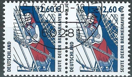 am 6.3.2003 wurde die Marke zu 2,60 € verausgabt, sie zeigt als Motiv die Seute Deern Bremerhaven. Hier einmal als waagerechtes Paar mit Versandstellenstempel: