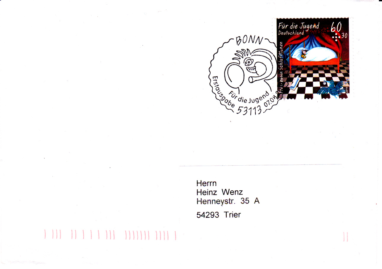 Der Ersttagssonderstempel aus Bonn zu dieser Ausgabe zeigt im Stempelbild ein Detail aus der Abbildung des Wertes zu 90 + 45 Cent, nämlich eine Figur aus den bösen Träumen.