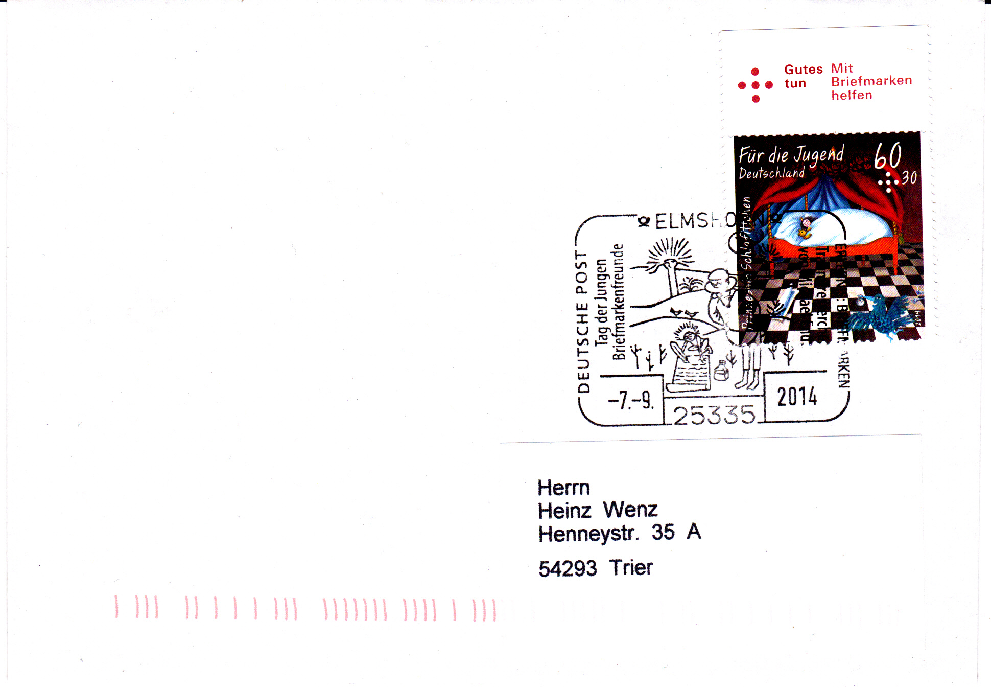 Aus 25335 Elmshorn kommt der nächste Stempel vom 7.9.2014 zum Tag der Jungen Briefmarkenfreunde 2014 mit dem Motiv "das Traumfresserchen schreibt für den König den Spruch zur Einladung des Traumfresserchen auf".
