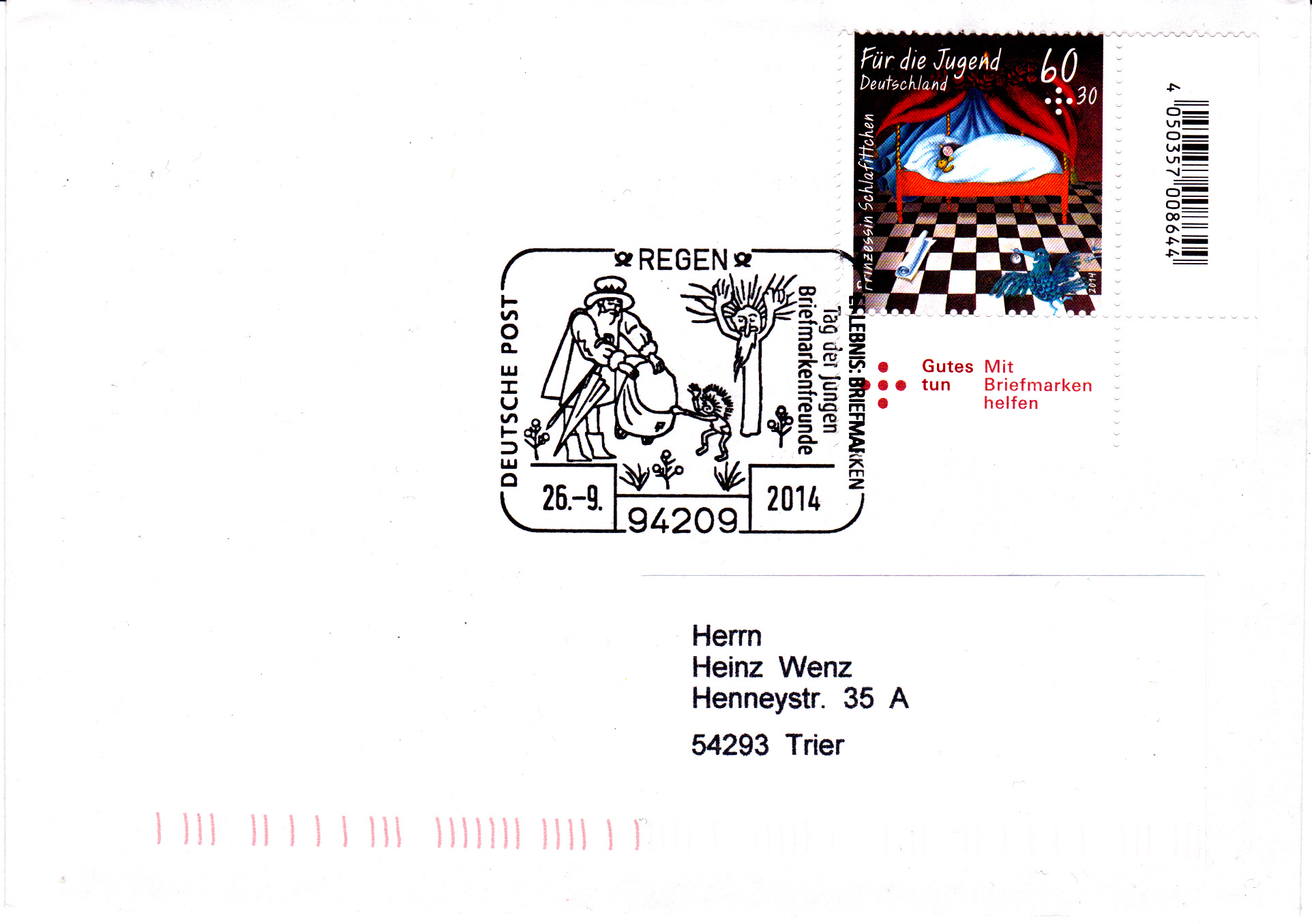 Am 6.9.2014 gab es einen Sonderstempel in 16540 Hohen Neuendorf zum Tag der Jungen Briefmarkenfreunde mit einer Abbildung aus dem Traumfresserchen: Prinzessin Schlafittchen im Bett und die Königin hält vor dem Bett Wache.