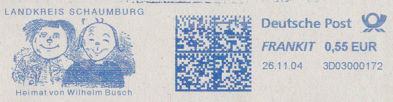 Dieser FRANKIT-Frankierstempel der Deutschen Post vom 26.11.2004 zeigt im Werbeeinsatz den Text "Landkreis Schaumburg - Heimat von Wilhelm Busch" und ein Abbildung von "Max und Moritz".