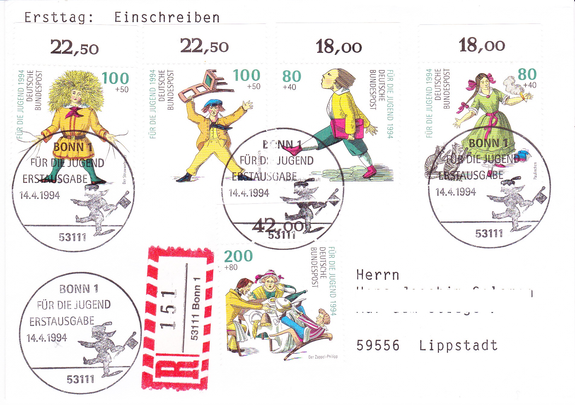 Satzbrief der Jugendmarken 1994 mit Struwwelpeter vom Ersttag mit dem Ersttagstempel Bonn. Der Brief ist überfrankiert.