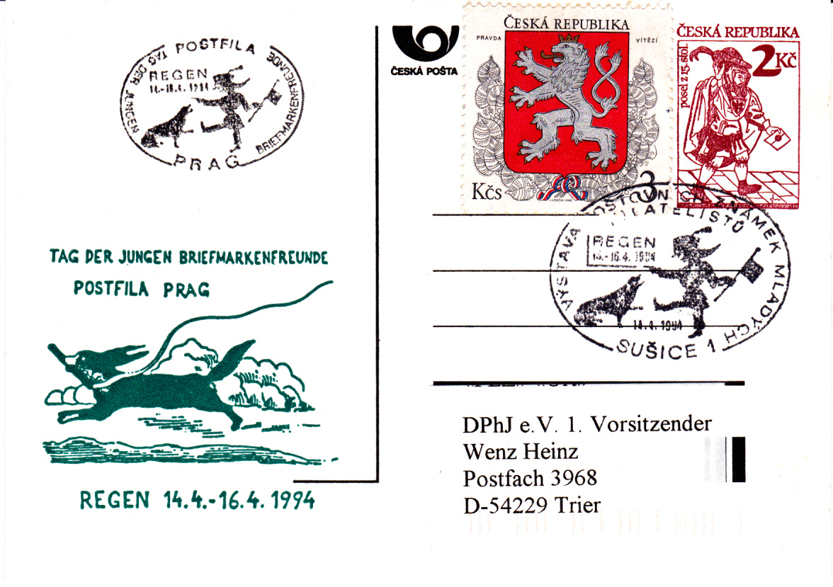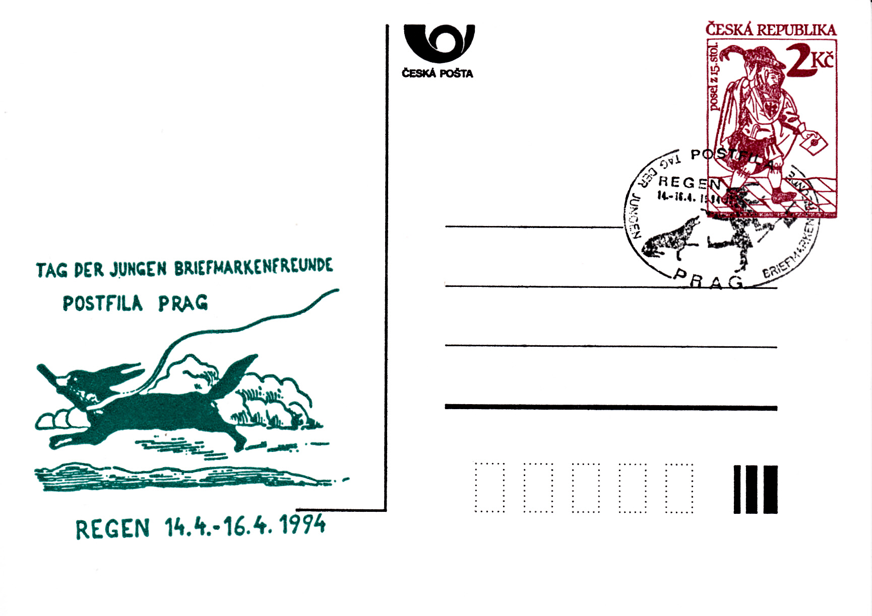 Hier zeige ich weitere Exemplare der Ganzsache der tschechischen Post zum Tag der Jungen Briefmarkenfreunde 1994 in Regen. Diese Postkarte wurde mit dem kleinen Sonderstempel entwertet.