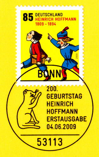 Zum 200 Geburtstag von Heinrich Hoffmann erschien diese Marke bei der Deutschen Post mit der Abbildung von Hans Guck-in-die-Luft und Ludwig mit dem Fähnchen. Der Ersttagssonderstempel aus Bonn zeigt eine Katze von Paulinchen.