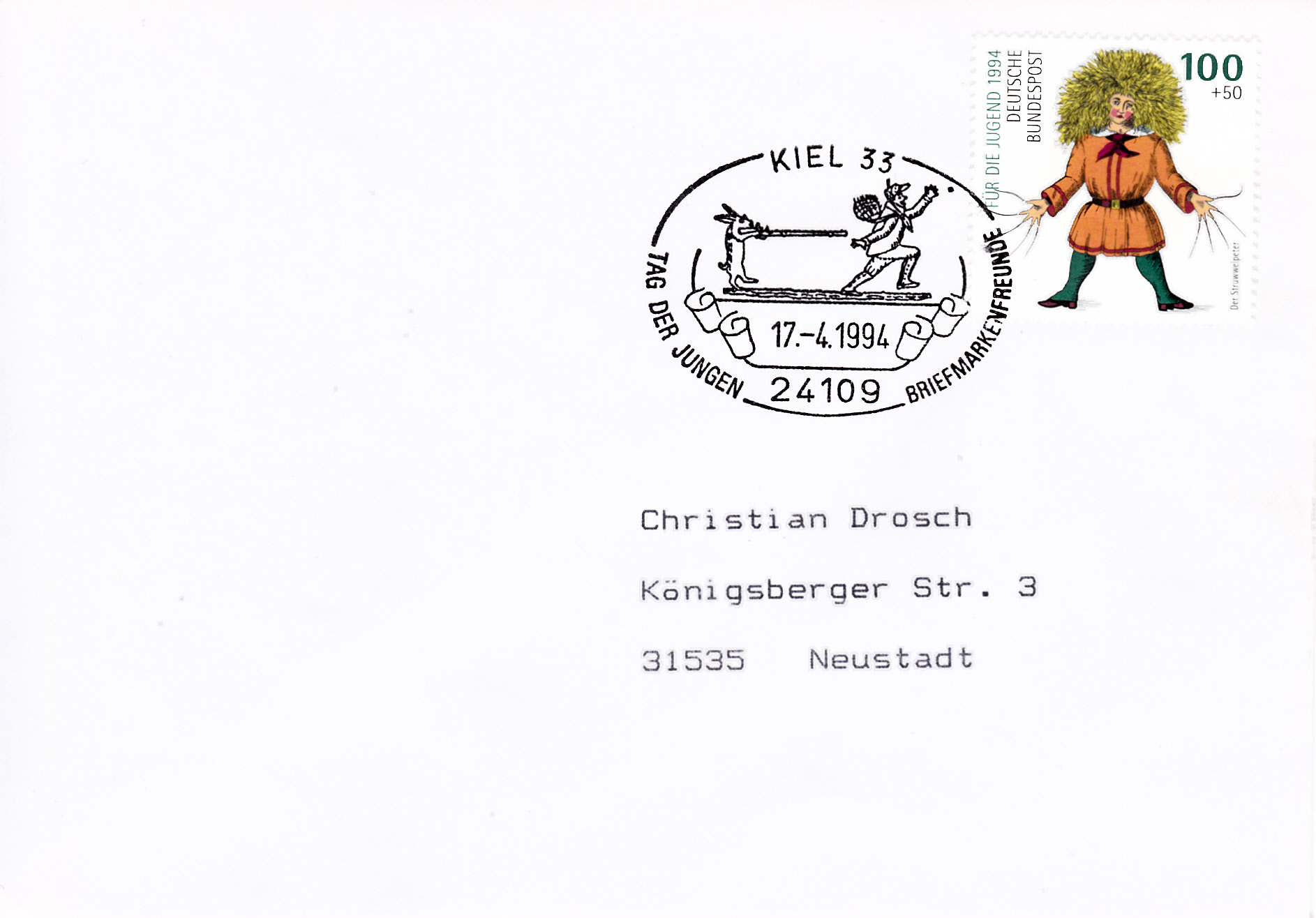 Aus Ausgabetag der Jugendmarken 1994 mit Motiven zum Struwwelpeter wurde auch in Wipperfürth ein Stempel zum Tag der Jungen Briefmarkenfreunde geführt.