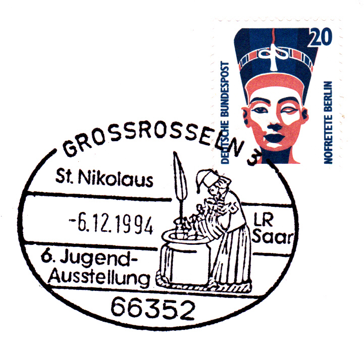 Der Sonderstempel aus Grossrosseln (Ortsteil St. Nikolaus) zur Briefmarkenausstellung am Nikolaustag 1994 zeigt die Illustration zu den Versen:
