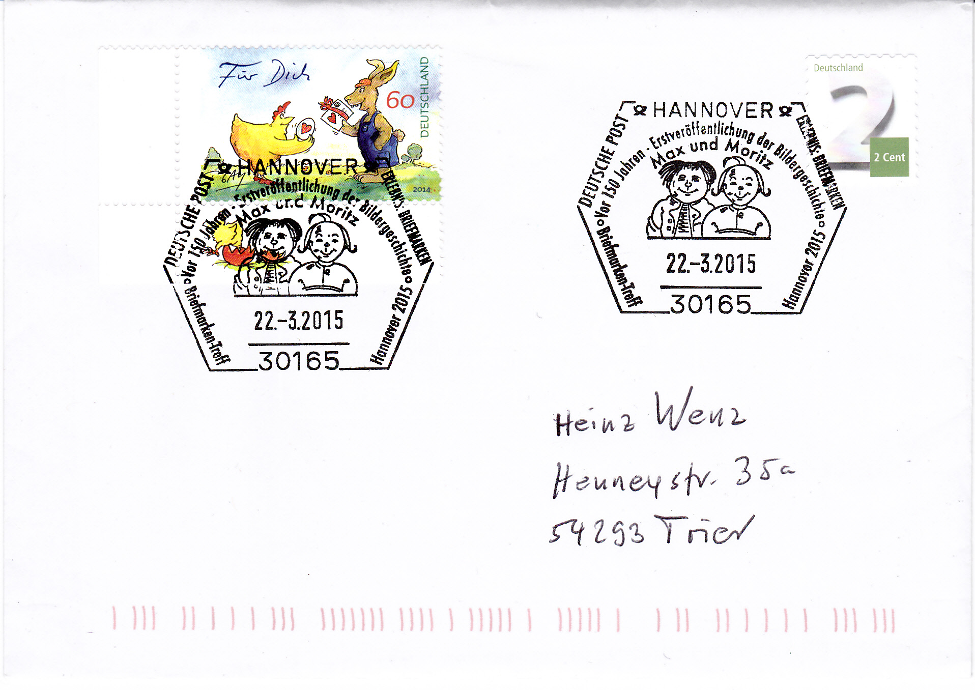Sonderstempel aus Hannover vom 22.3.2015 zum Jubiläum "150 Jahre Erstveröffentlichung der Bildergeschichte Max und Moritz"