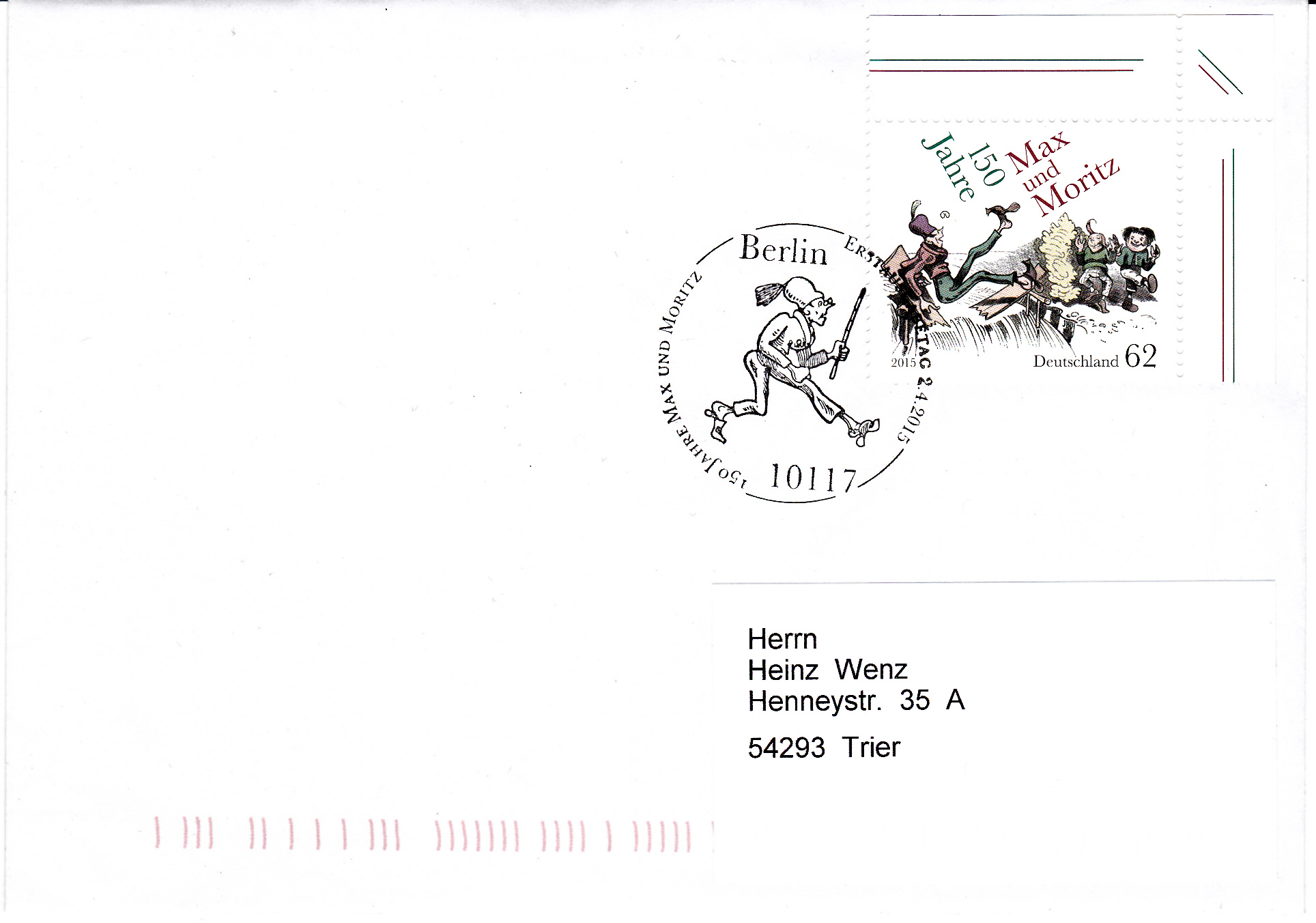 Zum Jubiläum "150 Jahre Max und Moritz" erscheint am 2.4.2015 bei der Deutschen Post AG eine Sondermarke zu 62 Cent (MiNr 3146) mit einem Bild aus dem dritten Streich, wie es bereits in vorhergehenden Beiträgen auf dem Sonderstempel aus Wiedensahl und auf der Bildpostkarte von 1990 zum Tag der Jungen Briefmarkenfreunde zu sehen war.