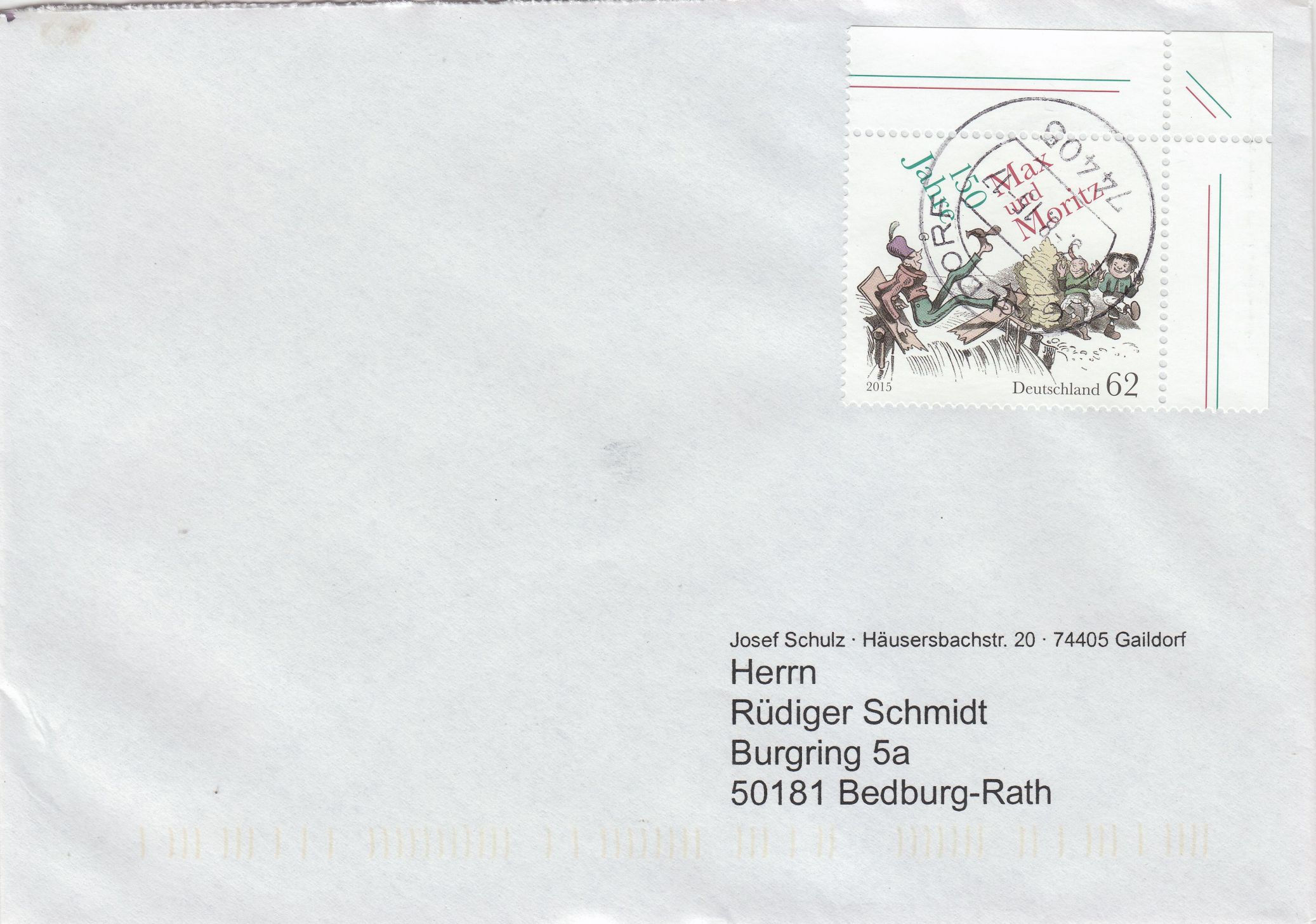 Hier noch einmal die Marke "Lebenslanges Lernen" (MiNr 2209) und der bereits gezeigte ESST jeweils mit dem Lehrer Lämpel passend zum vierten Streich, jetzt aber auf einem gelaufenen Ersttagsbrief von 21 bis 50 g.