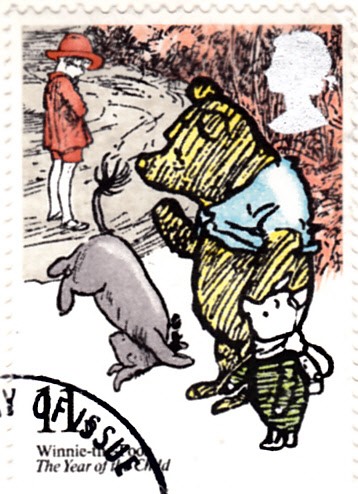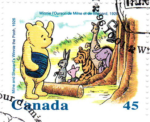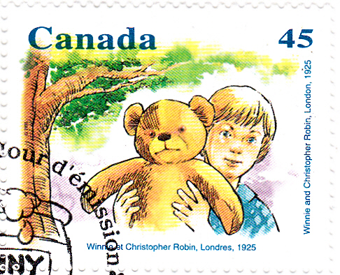 Diese Marke aus Kanada (MiNr 1597) zeigt Christopher Robin Milne (geb 21. Aug. 1920 in Chelsea, London; gest. 20. April 1996 in Totnes, Devon; britischer Autor, Sohn von A. A. Milne und Vorbild für die literarische Figur "Christopher Robin" in den Büchern um "Pu den Bären") mit Teddybär.