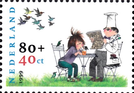 Eine Marke (MiNr 1751) aus der niederländischen Serie "Voor het Kind" 1999 zeigt eine Illustration zu "Otje und ihr Papa Toss".
