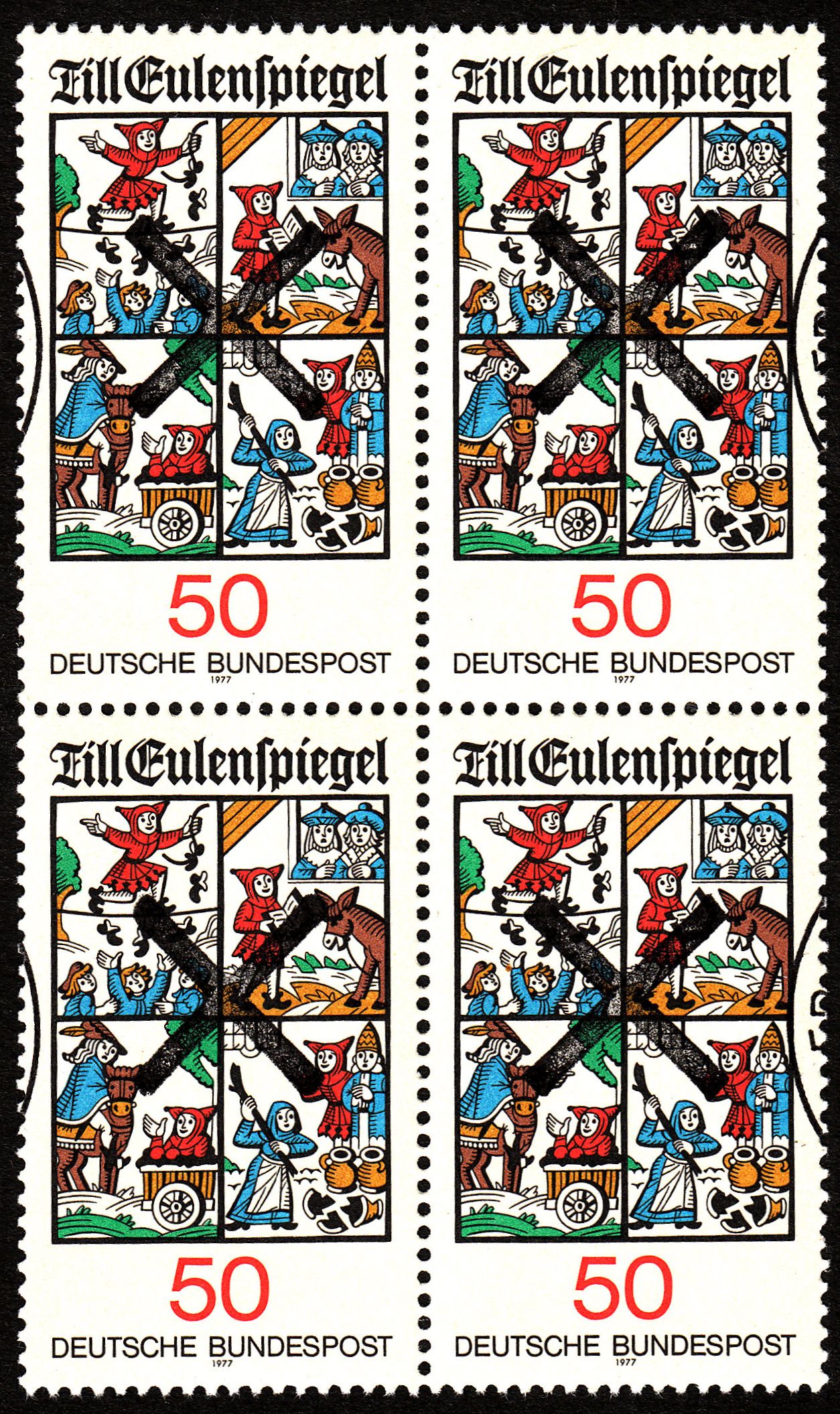 Diese am 13.01.1977 erschienene Marke, Bund MiNr. 922, zeigt vier Szenen der Streiche von Till Eulenspiegel aus dem gleichnamigen Volksbuch, hier als sehr selten einmal zu findender Viererblock mit aufgedruckter Bogenentwertung per Andreaskreuzen, wie sie bei der Versandstelle bei Bögen mit aufgedruckten Vollstempeln bei den Marken des Bogens üblich war, die keinen Vollstempel erhielten:
