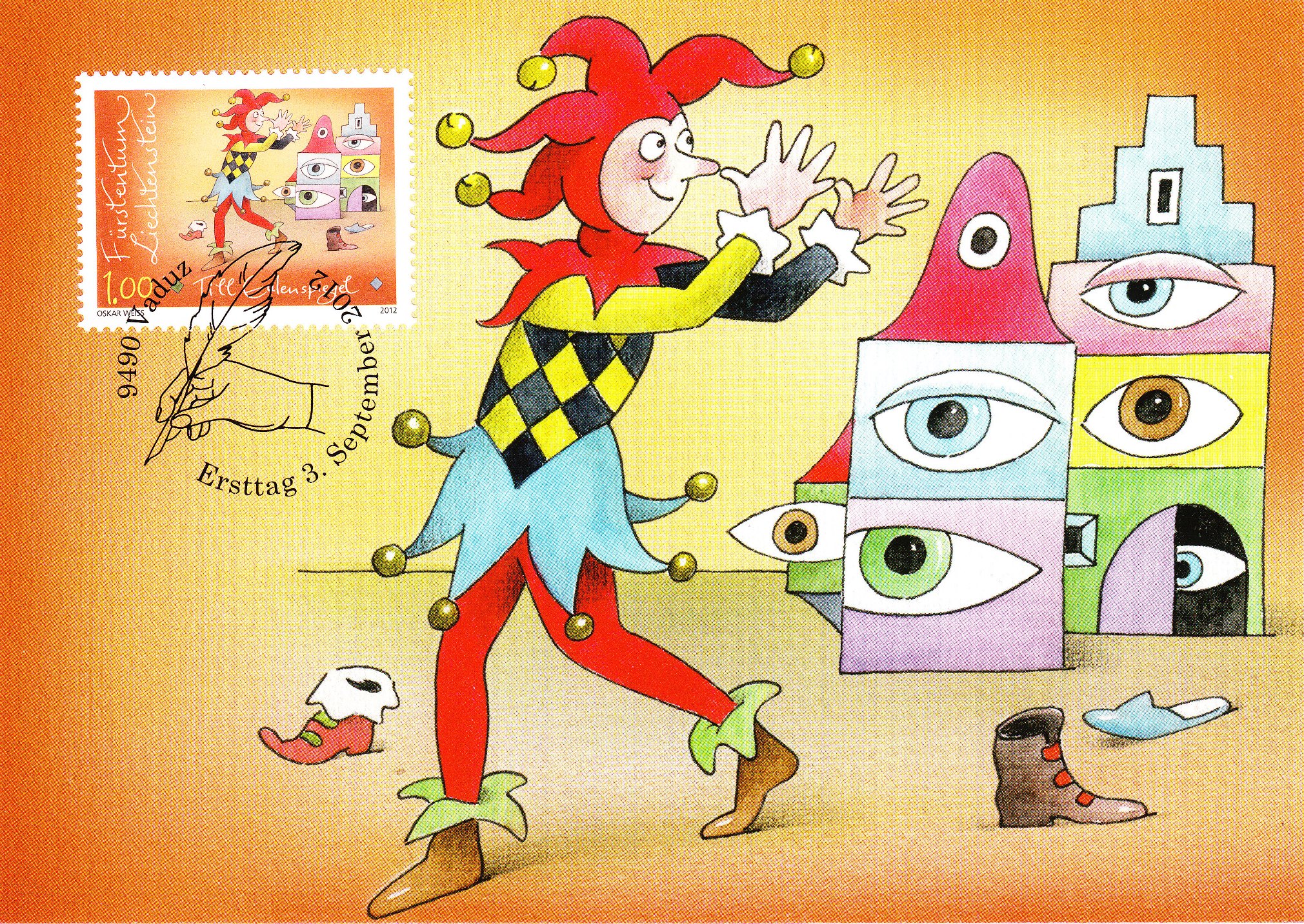 Im Jahre 2012 schuf der Schweizer Künstler Oskar Weiss für eine Sondermarkenausgabe aus dem Fürstentum Liechtenstein insgesamt 8 Illustrationen zu berühmten Figuren der klassischen Literatur, darunter auch diese zum Thema Till Eulenspiegel, der eine "Lange Nase" macht, also gerade jemanden verspottet, hier als Maximumkarte: