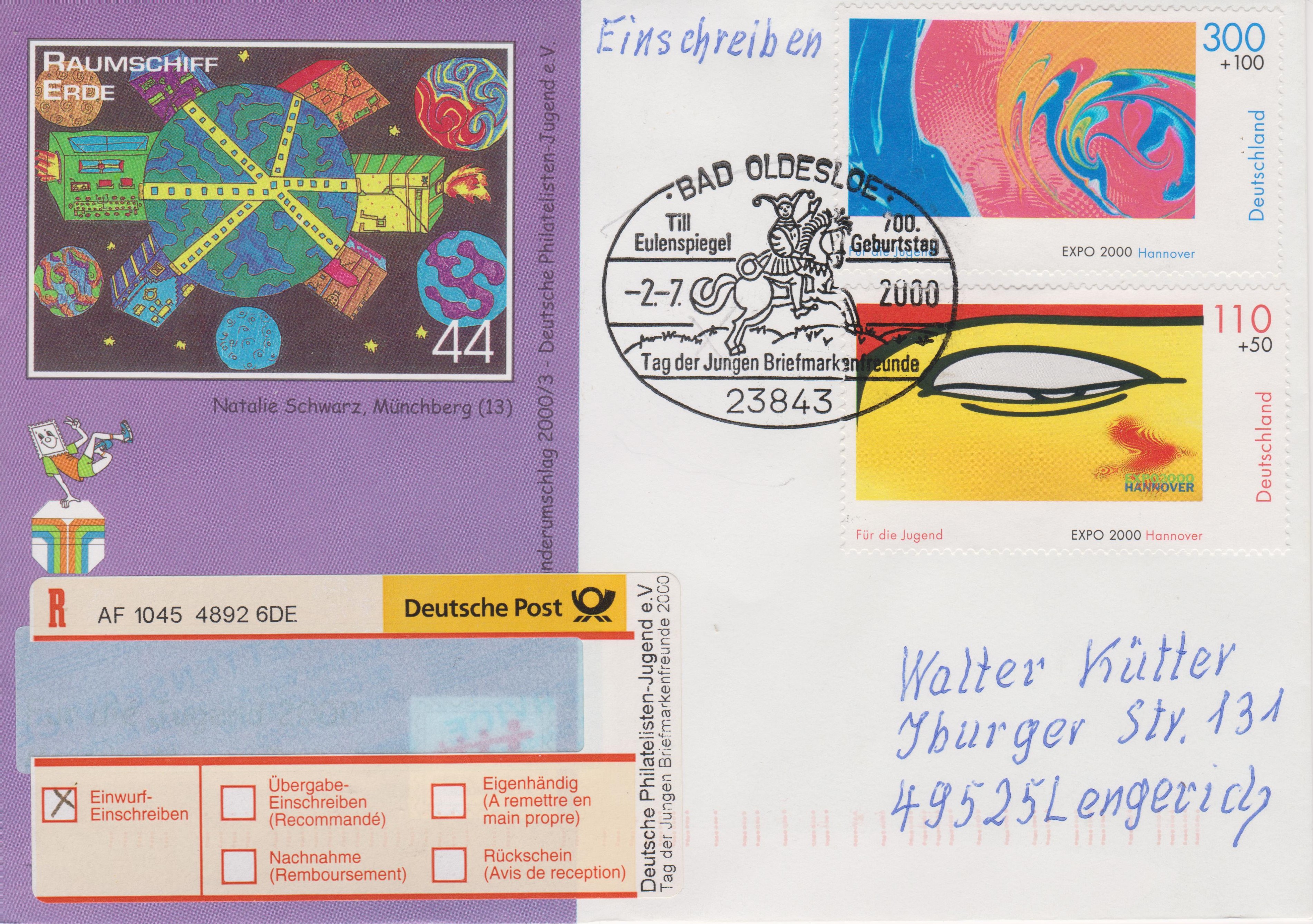 Brief per Einschreiben, Portostufe 410 Pf, frankiert mit zwei Postwertzeichen "Für die Jugend EXPO 2000 Hannover" mit Sonder-R-Zettel zum "Tag der jungen Briefmarkenfreunde 2000" sowie Sonderstempel aus BAD OLDESLOE "700. Geburtstag Till Eulenspiegel", echt gelaufen und entsprechend codiert: