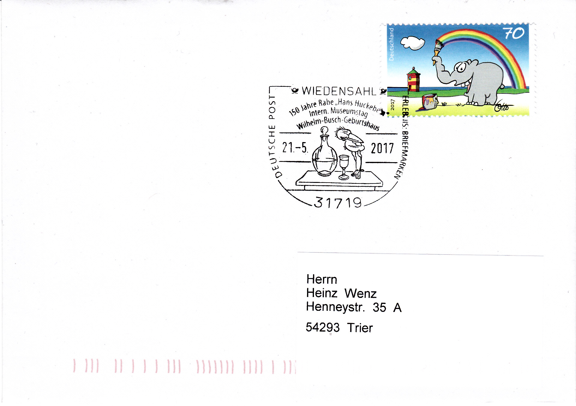 Zum Jubiläum "150 Jahre Rabe Hans Huckebein" wurde in Wiedensahl ein Sonderstempel mit der Abbildung einer Szene aus der gleichnamigen Geschichte. Der Text zu diesem Bild lautet bei Wilhelm Busch:
