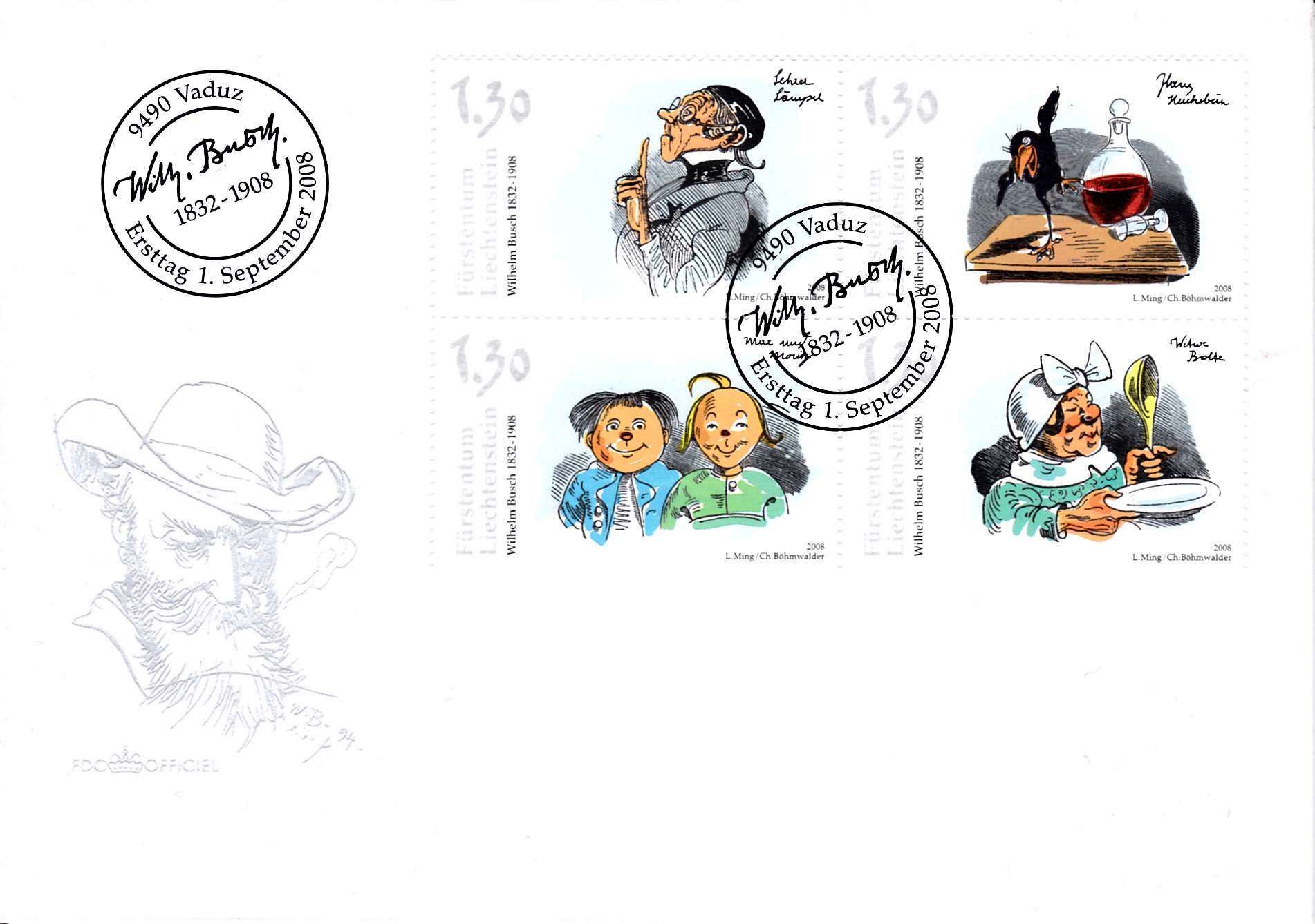 Diese Marke wurde zusammen mit sieben weiteren Marken mit Motiven von Bildergeschichten von Wilhelm Busch gedruckt. Die Marke mit Hans Huckebein ist im oberen Teil des Bogen zu finden. Hier zeige ich einen FDC mit dem Zusammendruck der oberen vier Marken aus dem Bogen und dem Ersttagsonderstempel aus Vaduz.