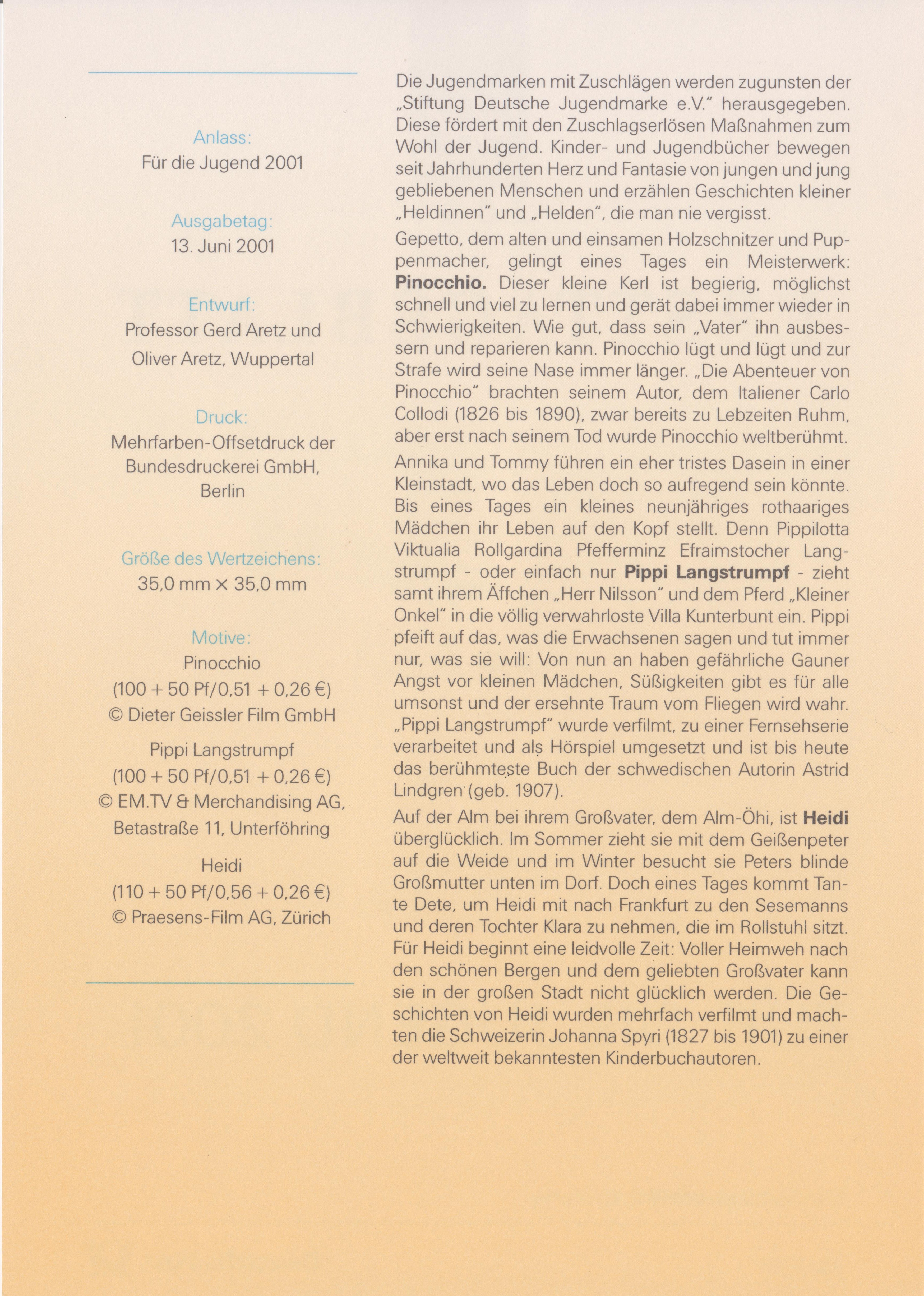 Pinocchio auf dem Ersttagsblatt 25/2001: