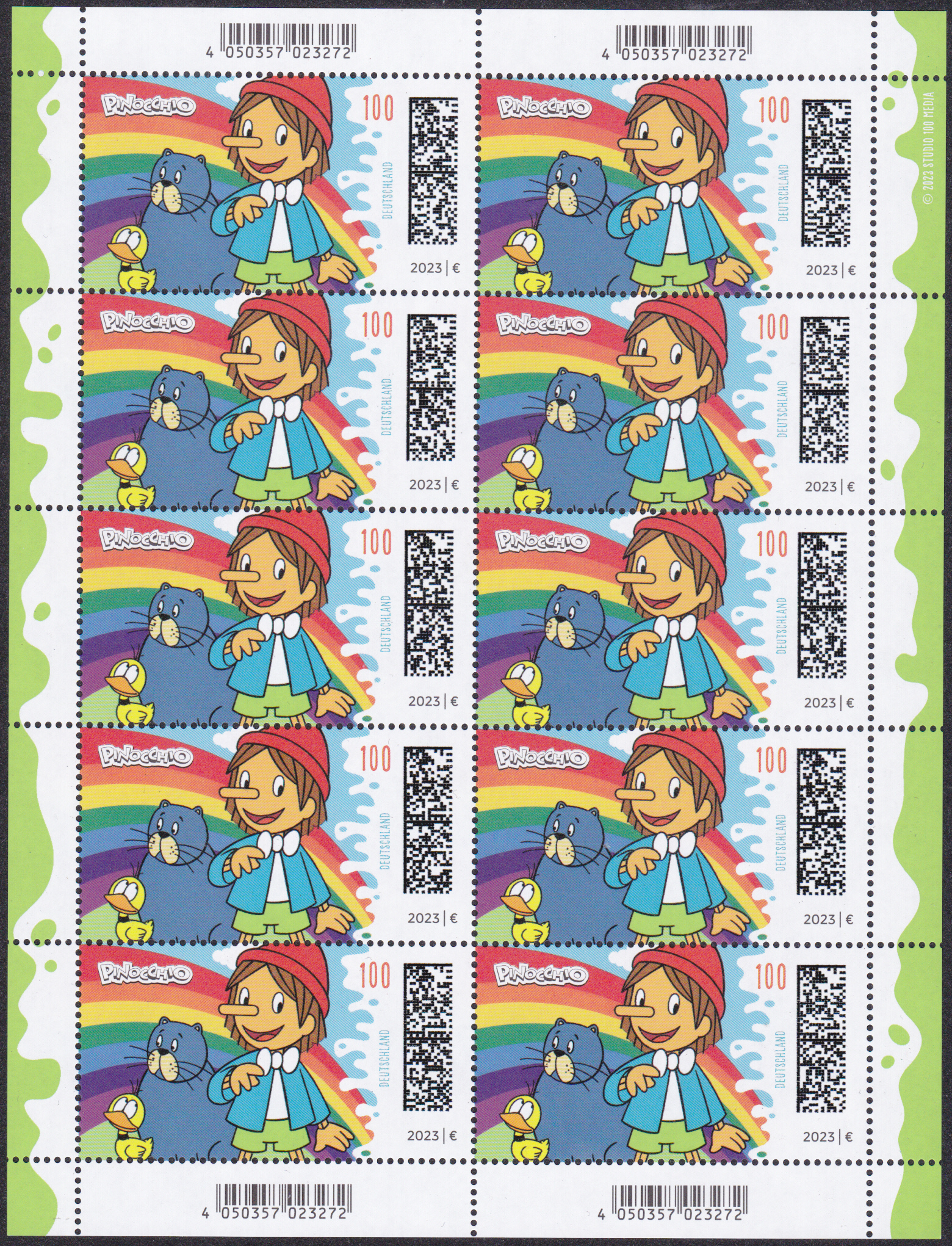 Bei der Deutschen Post ist eine Marke (MiNr 3804) in der Serie "Helden der Kindheit" erschienen. Sie zeigt die Holzpuppe Pinocchio mit der Ente Gina und der Katze Giulietta vor einem Regenbogen. Ich stelle hier eine Marke vom Eckrand mit EAN-Codierung vor.