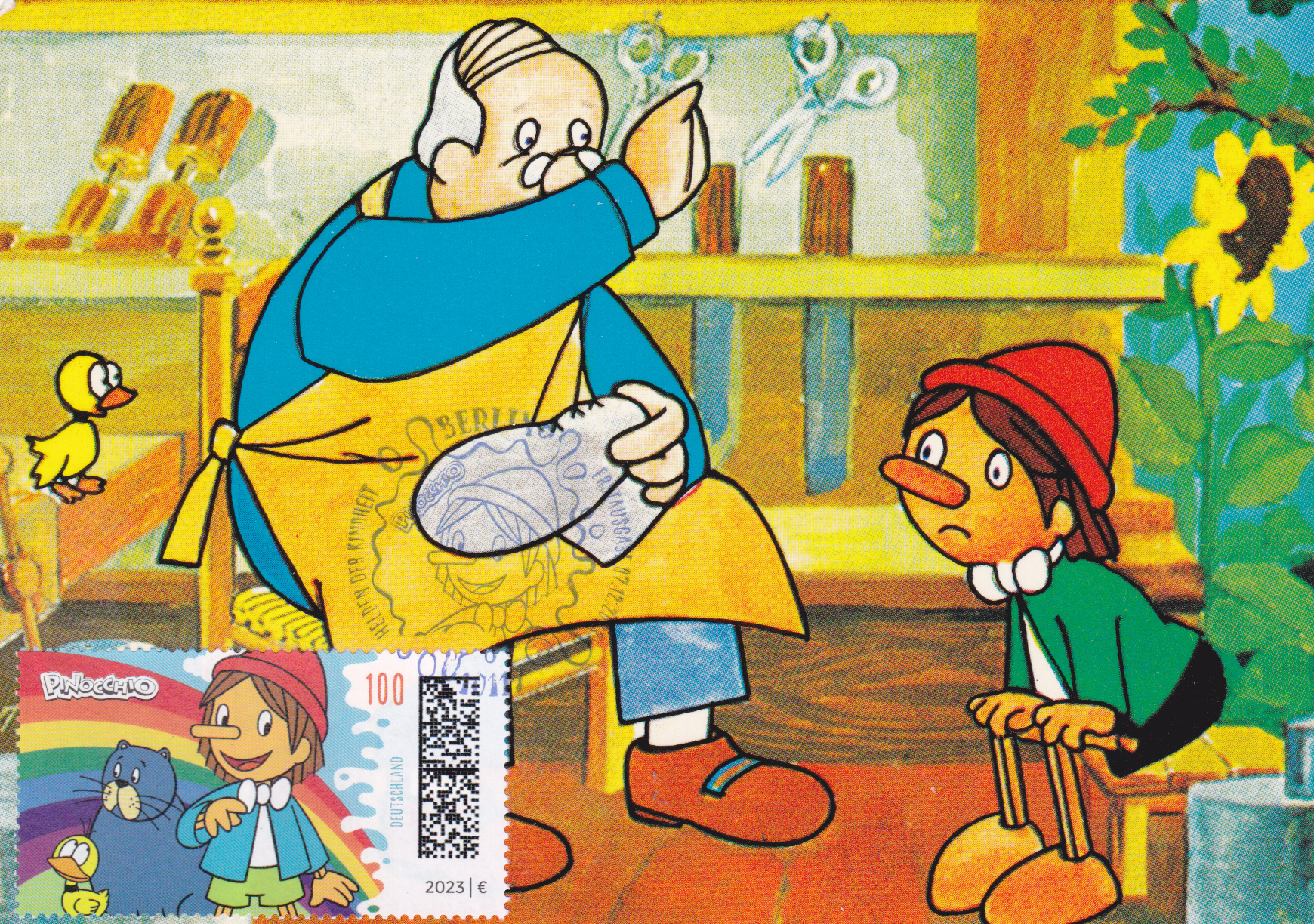 Weitere Maximumkarte mit dieser Marke mit Pinocchio und dem passenden Ersttagsonderstempel aus Berlin.