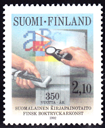 In Finnland erinnert diese Marke (MiNr 1194) an 350 Jahre Buchdruck in Finnland. Auf dem Markenbild werden Computersatz und Bleisatz dargestellt.