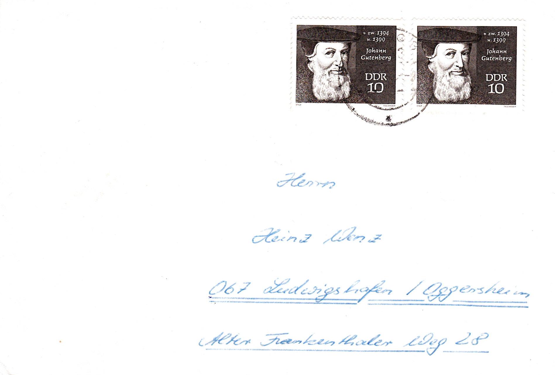 Die bereits gezeigte Marke aus der DDR aus der Serie "Berühmte Persönlichkeiten" einem Porträt von Gutenberg ( MiNr 1535) ist auf diesem Brief nach Ludwigshafen zweifach als Frankatur verklebt worden.