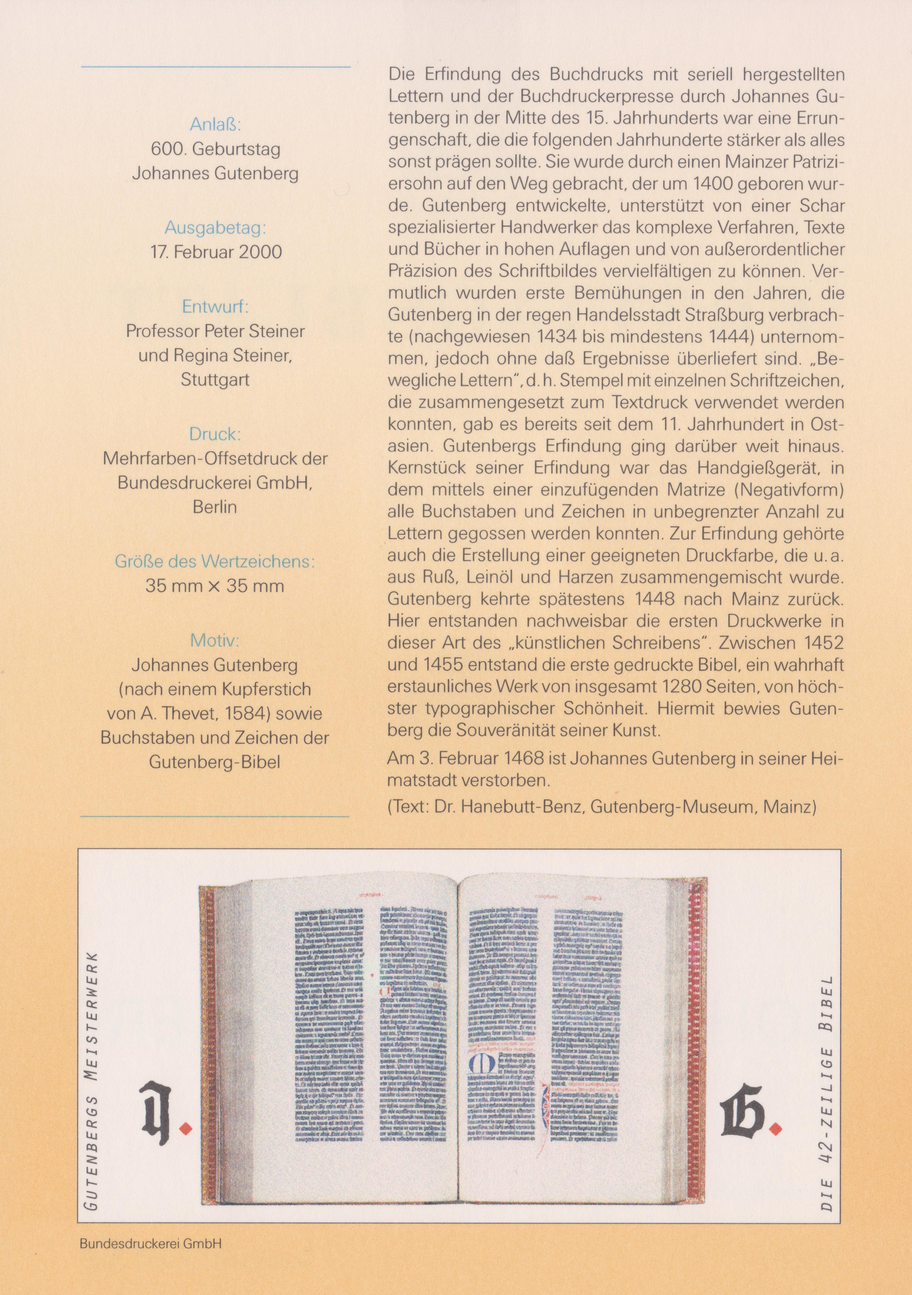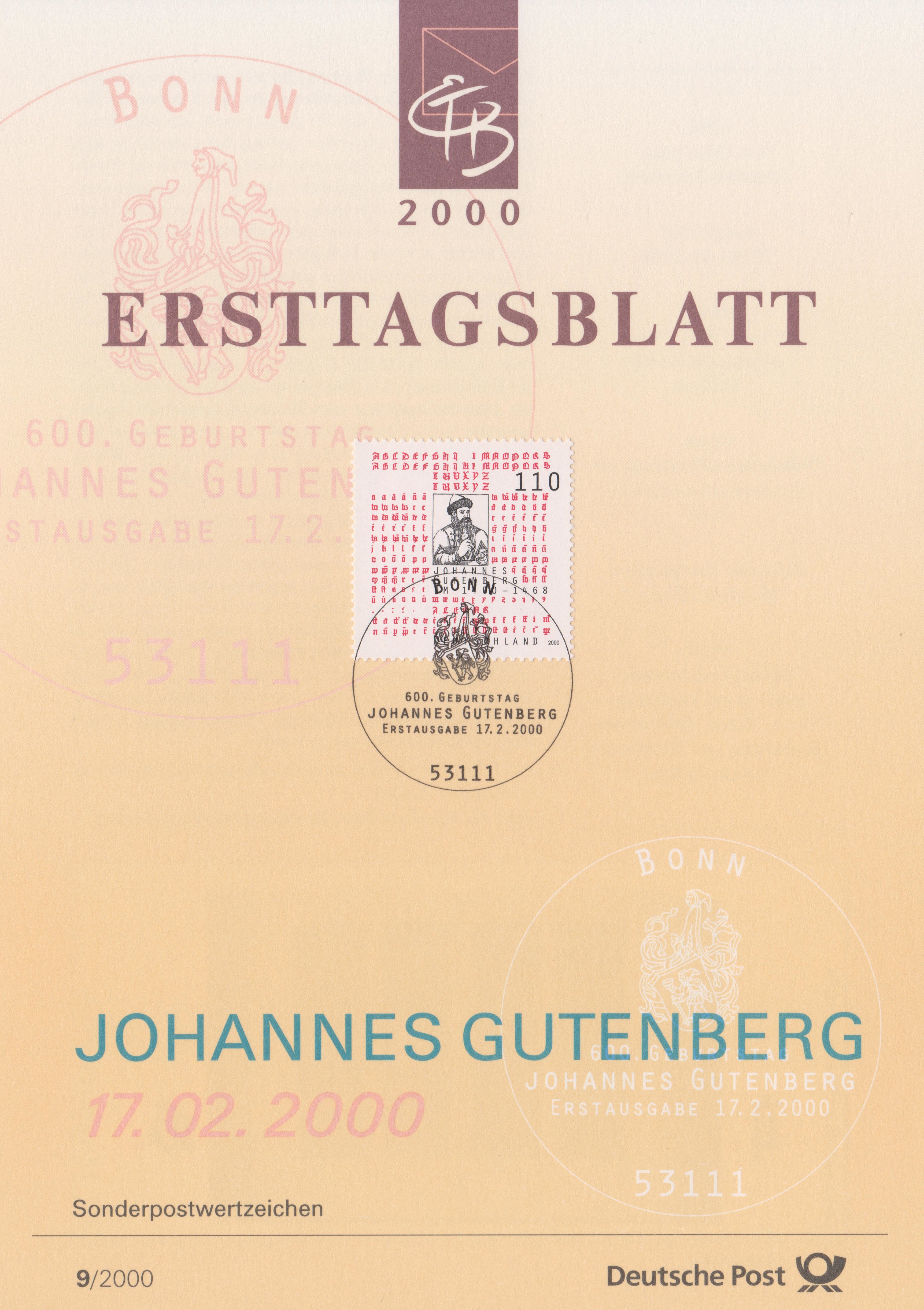 ETB 9/2000 erschien zum 600. Geburtstag von Johannes Gutenberg bei der Deutschen Post AG mit BUND MiNr. 2098, als Motiv wurden Beispielen für Buchstaben und Satzzeichen aus der Gutenberg-Bibel gewählt: