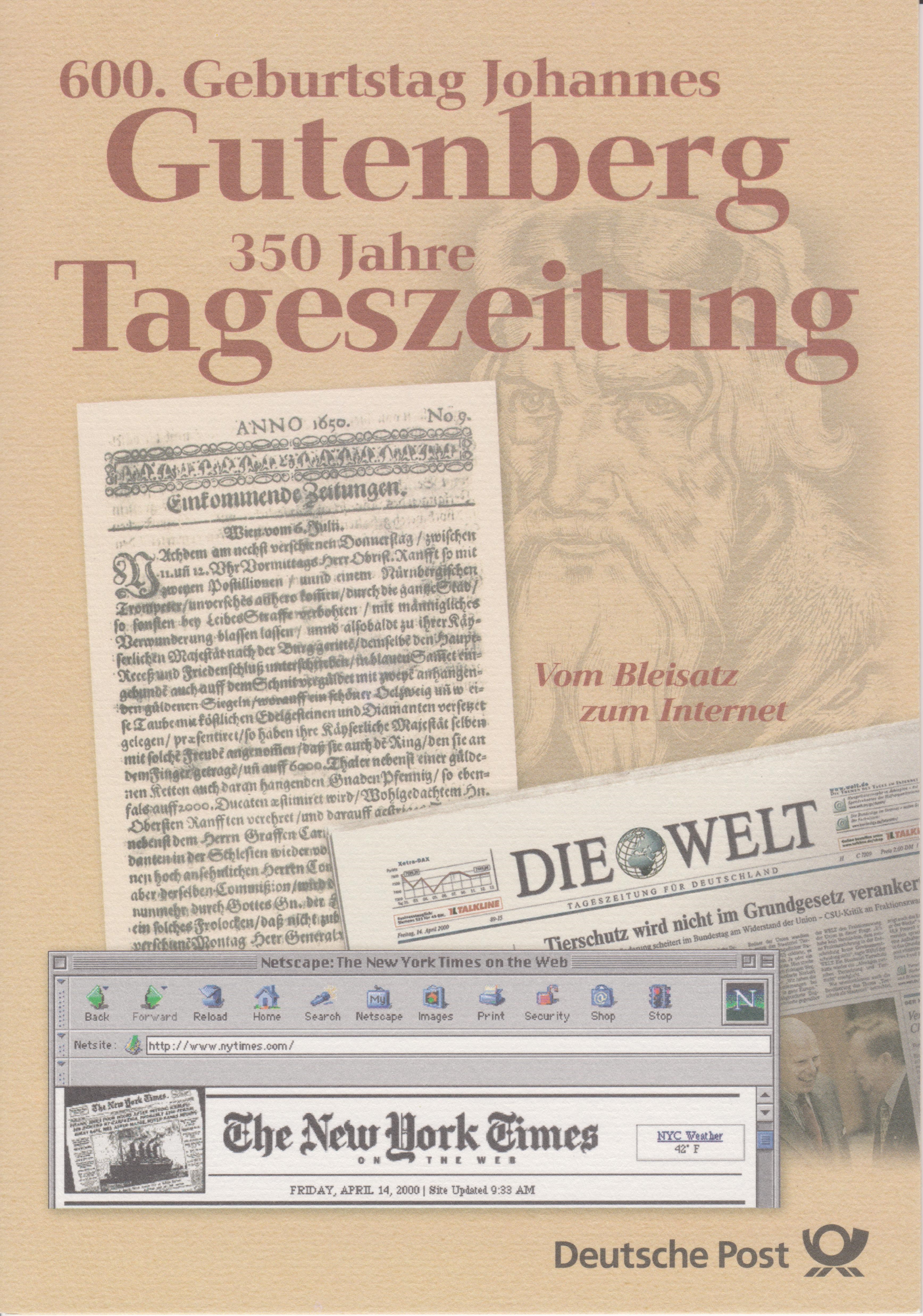 "600. Geburtstag Johannes Gutenberg / 350 Jahre Tageszeitung" = Faltblatt "Deutsche Post":