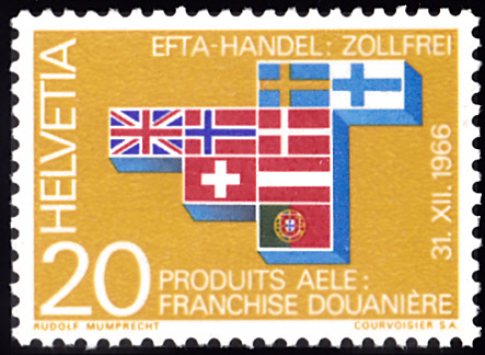 Zur Aufhebung der Zollschranken zwischen den EFTA-Ländern ist in der Schweiz eine Marke (MiNr 852) mit den Flaggen der EFTA-Staaten und der assoziierten Länder erschienen.