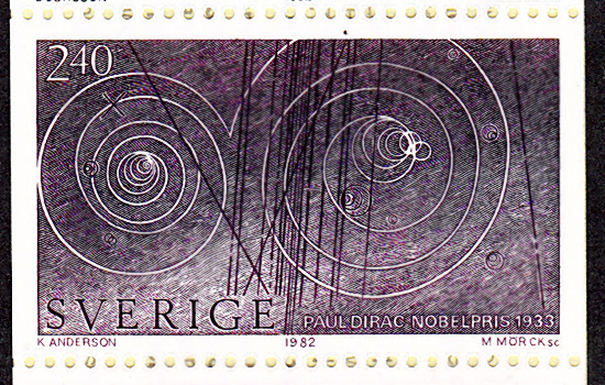 In Schweden erschien 1982 in einem Markenheftchen "Nobelpreisträger für Atomphysik" (MiNr MH 91) auch diese Marke für Paul Dirac (MiNr 1217). Die Marke zeigt die Spur eines Elektron-Positronpaares (Antiteilchentheorie von Paul Dirac).