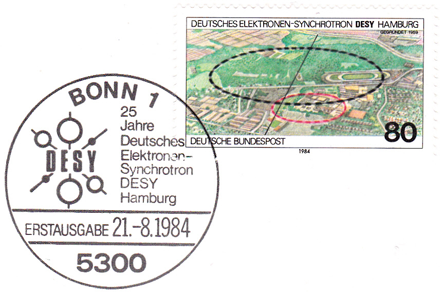 Diese Marke "25 Jahre Deutsches Elektronen-Synchrotron (DESY), Hamburg" wurde mit dem Ersttagsonderstempel aus Bonn gestempelt. Als Motiv für den Stempel wurde das Logo des DESY gewählt.