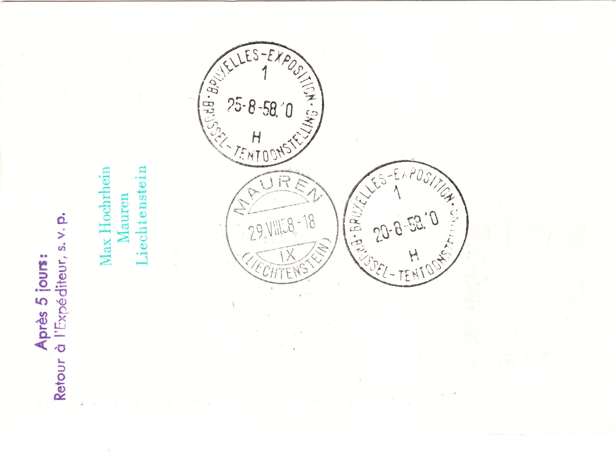Bei diesem Beleg wurde rückseitig mit zwei Tagesstempeln des Ausstellungspostamtes vom 20.08.1958 sowie 25.08.1958 die Einhaltung der vom Absender gewünschten Lagerfrist von 5 Tagen dokumentiert. Am 29.08.1958 kam der Beleg dann in "MAUREN" in Liechtenstein an: