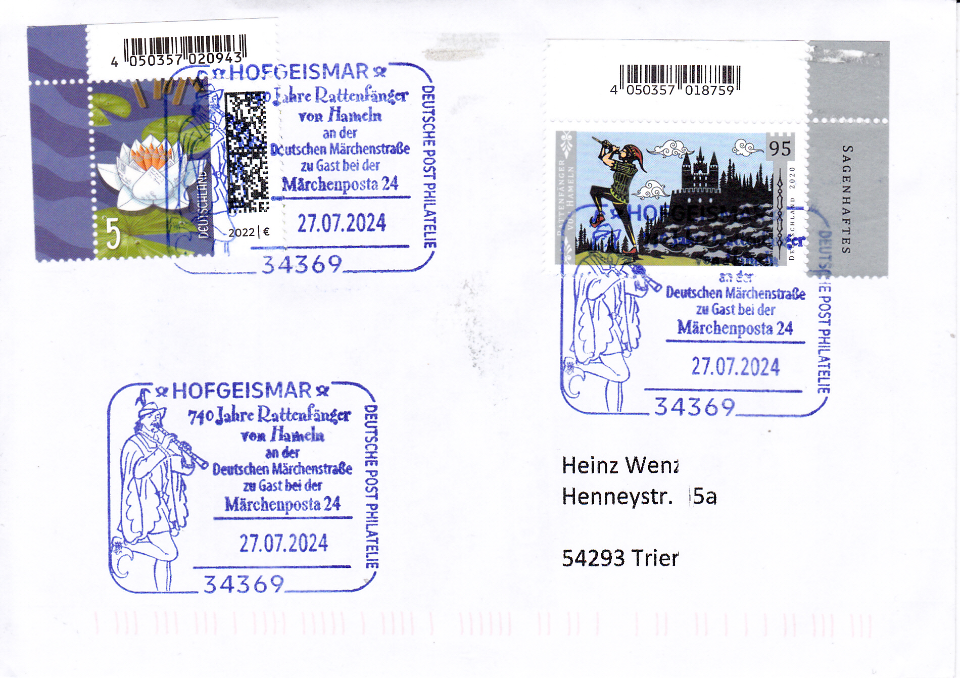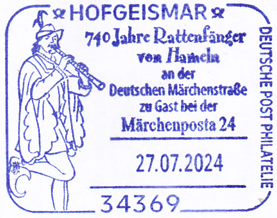 Brief mit der Marke aus der Serie "Sagenhaftes Deutschland" (MiNr 3578) mit dem Motiv "Der Rattenfänger von Hameln" und einem Sonderstempel aus Hofgeismar vom 27.7.2024 aus Anlass "740 Jahre Rattenfänger von Hameln" und zur Märchenposta 24.