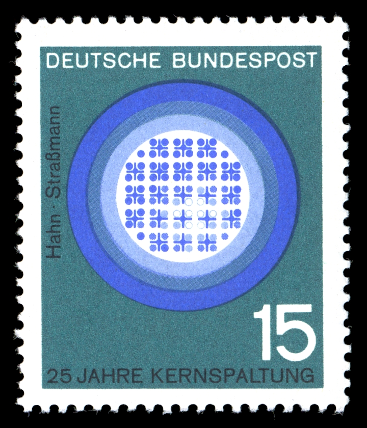 Dieses Postwertzeichen der Deutschen Bundespost, MiNr. 441, nennt im Zusammenhand mit einem schematisch dargestellten Kernreaktor seinen Namen: