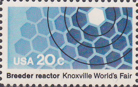 Auf dieser Marke aus den USA (MiNr 1587) zur Weltausstellung in Knoxville wird ebenfalls eine schematische Darstellung eines Brutreaktors gezeigt.