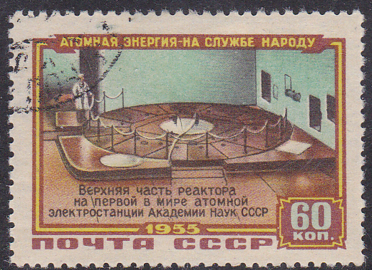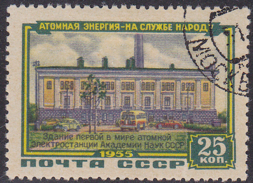 Zur Inbetriebnahme des 1. Kernkraftwerkes der Welt an der Akademie der Wissenschaften der UdSSR am 27.6.1954 in Obninsk (bei Moskau) erschien am 31.1.1956 in der Sowjetunion eine Markenserie. Hier die Marke zu 25 Kopeken (MiNr 1802) mit einer Abbildung des Kraftwerkes.