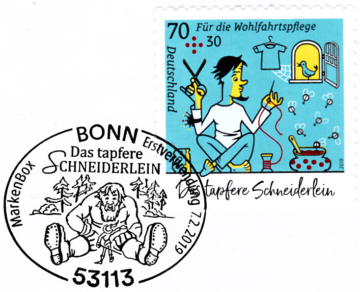 Für die selbstklebende Marke (MiNr 3444) aus dem Markenheftchen gab es natürlich einen weiteren Erstverwendungsstempel aus Bonn. Er zeigt das tapfere Schneiderlein beim Anfertigen seines Gürtels mit der Aufschrift "Sieben auf einen Streich".