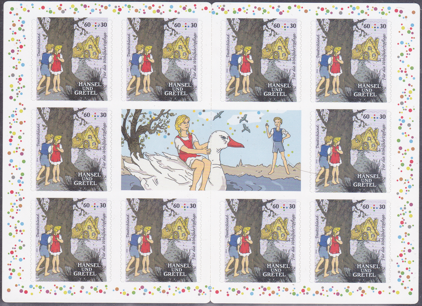 Zur selbstklebenden Wohlfahrtsmarke zu 60+30 Cent der Ausgabe 2014 mit dem Motiv zum Märchen "Hänsel und Gretel" zeige ich hier das Markenheftchen (MH-MiNr 96).