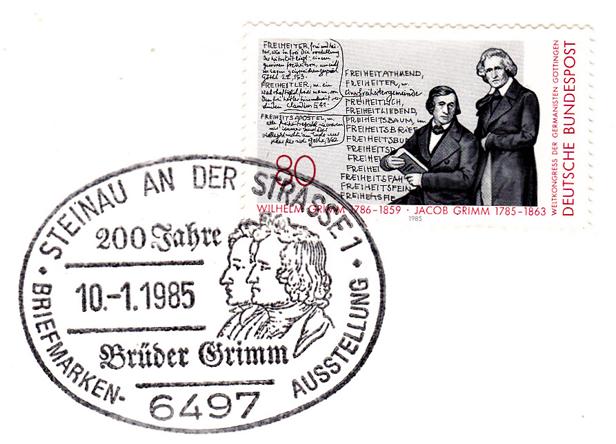 Hier ein Sonderstempel von 1985 aus Kassel aus Anlass Anlass 200 Jahre Gebrüder Grimm (Geburtsjahrgang Jakob Grimm 1785).