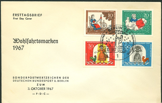 Die komplette Berliner "Frau Holle"-Ausgabe auf einem nicht illustrierten Ersttagsbrief. Als Stempelinhalt ist die den Apfelbaum schüttelnde "fleißige" Marie dargestellt. Bekanntlich fürchtet sich die spätere Pechmarie vor diesem "Charaktertest".